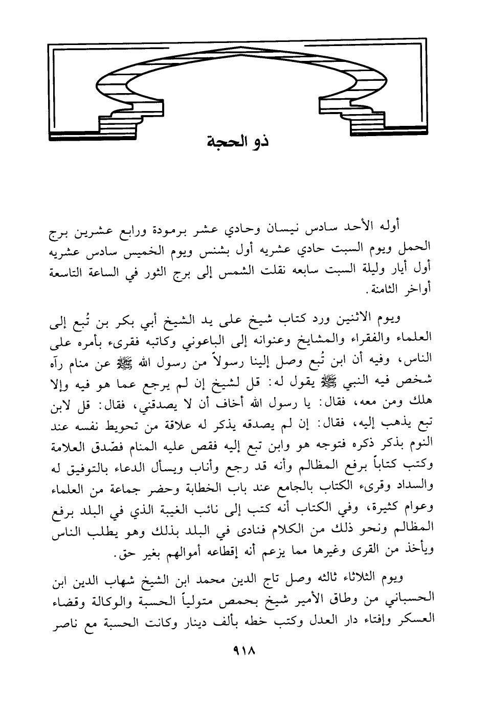 ويوم الاثنين ورد كتاب شيخ على يد الشيخ أبي بكر بن تُبع إلى العلماء والفقراء والمشايخ وعنوانه إلى الباعوني وكاتبه فقرئ بأمره على الناس، وفيه أن ابن تُبع وصل إلينا رسولاً من رسول الله - صلى الله عليه وسلم - عن منام رآه شخص فيه النبي - صلى الله عليه وسلم - يقول له: قل لشيخ إن لم يرجع عما هو فيه وإلا هلك ومن معه، فقال: يا رسول الله أخاف أن لا يصدقني، فقال: قل لابن تبع يذهب إليه، فقال: إن لم يصدقه يذكر له علاقة من تحويط نفسه عند النوم بذكر ذكره فتوجه هو وابن تبع إليه فقص عليه المنام فضدق العلامة وكتب كتاباً برفع المظالم وأنه قد رجع وأناب ويسأل الدعاء بالتوفيق له والسداد وقرئ الكتاب بالجامع عند باب الخطابة وحضر جماعة من العلماء وعوام كثيرة، وفي الكتاب أنه كتب إلى نائب الغيبة الذي في البلد برفع المظالم ونحو ذلك من الكلام فنادى في البلد بذلك وهو يطلب الناس ويأخذ من القرى وغيرها مما يزعم أنه إقطاعه أموالهم بغير حق.