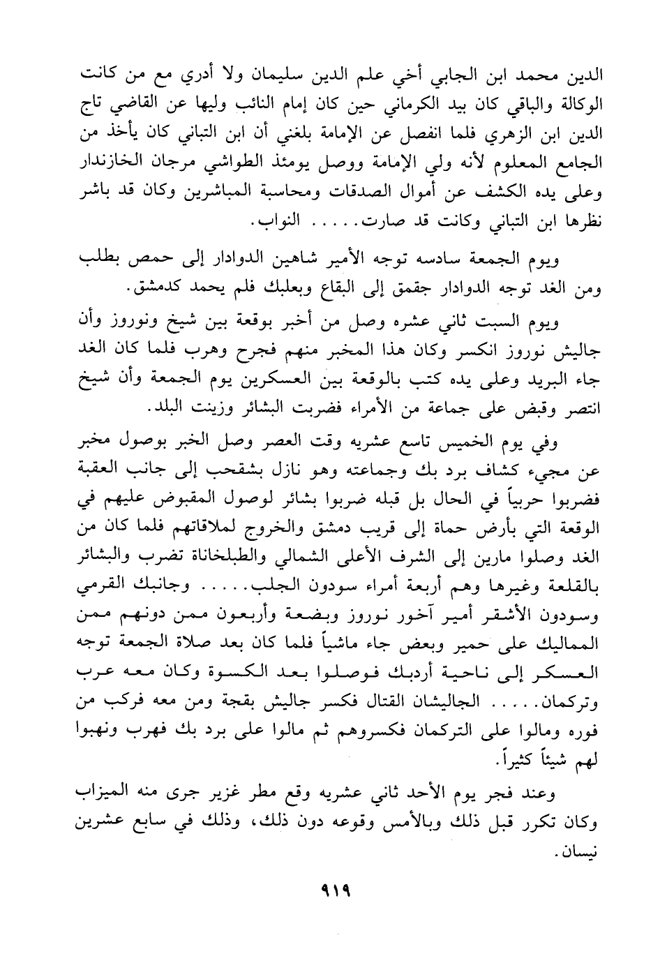 وفي يوم الخميس تاسع عشريه وقت العصر وصل الخبر بوصول مخبر عن مجيء كشاف برد بك وجماعته وهو نازل بشقحب إلى جانب العقبة فضربوا حربياً في الحال بل قبله ضربوا بشائر لوصول المقبوض عليهم في الوقعة التي بأرض حماة إلى قريب دمشق والخروج لملاقاتهم فلما كان من الغد وصلوا مارين إلى الشرف الأعلى الشمالي والطبلخاناة تضرب والبشائر بالقلعة وغيرها وهم أربعة أمراء سودون الجلب ..... وجانبك القرمي وسودون الأشقر أمير آخور نوروز وبضعة وأربعون ممن دونهم ممن المماليك على حمير وبعض جاء ماشياً فلما كان بعد صلاة الجمعة توجه العسكر إلى ناحية أردبك فوصلوا بعد الكسوة وكان معه عرب وتركمان .... الجاليشان القتال فكسر جاليش بقجة ومن معه فركب من فوره ومالوا على التركمان فكسروهم ثم مالوا على برد بك فهرب ونهبوا لهم شيئاً كثيراً.
