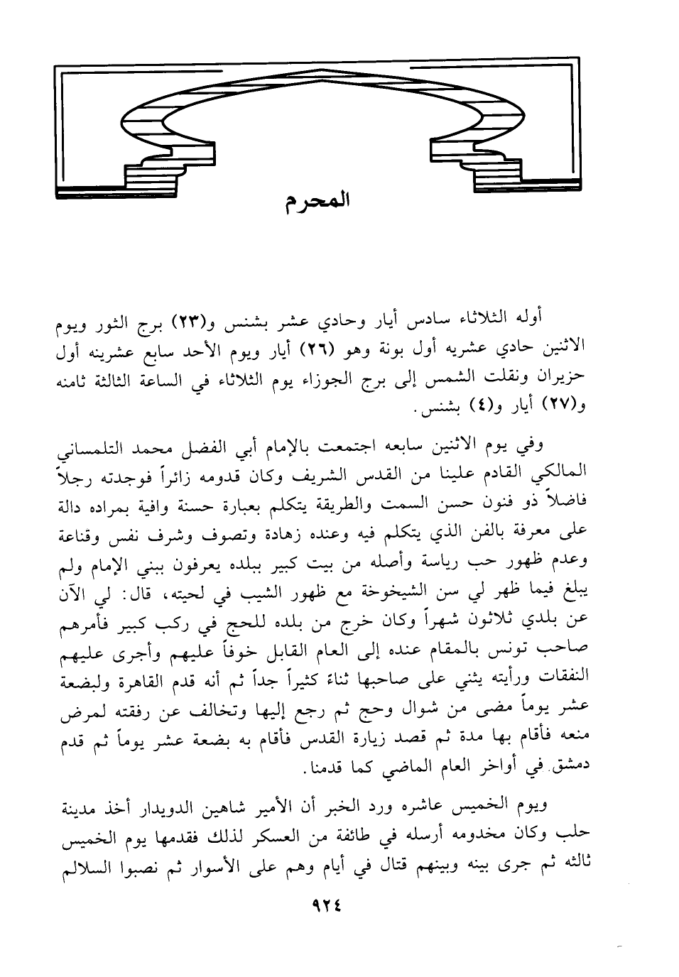 وفي يوم الاثنين سابعه اجتمعت بالإمام أبي الفضل محمد التلمساني المالكي القادم علينا من القدس الشريف وكان قدومه زائراً فوجدته رجلاً فاضلاً ذو فنون حسن السمت والطريقة يتكلم بعبارة حسنة وافية بمراده دالة على معرفة بالفن الذي يتكلم فيه وعنده زهادة وتصوف وشرف نفس وقناعة وعدم ظهور حب رياسهَ وأصله من بيت كبير ببلده يعرفون ببني الإمام ولم يبلغ فيما ظهر لي سن الشيخوخة مع ظهور الشيب في لحيته، قال: لي الآن عن بلدي ثلاثون شهراً وكان خرج من بلده للحج في ركب كبير فأمرهم صاحب تونس بالمقام عنده إلى العام القابل خوفاً عليهم وأجرى عليهم النفقات ورأيته يثني على صاحبها ثناء كثيراً جداً ثم أنه قدم القاهرة ولبضعة عشر يوماً مضى من شوال وحج ثم رجع إليها وتخالف عن رفقته لمرض منعه فأقام بها مدة ثم قصد زيارة القدس فأقام به بضعة عشر يوماً ثم قدم دمشق في أواخر العام الماضي كما قدمنا.