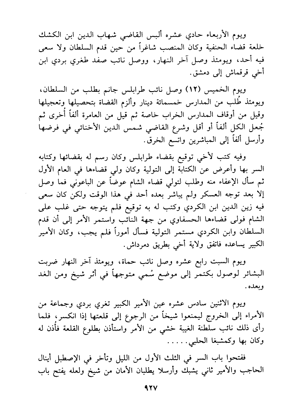 وفيه كتب لأخي توقيع بقضاء طرابلس وكان رسم له بقضائها وكتابه السر بها وأعرض عن الكتابة إلى التولية وكان ولي قضاءها في العام الأول ثم سأل الإعفاء منه وطلب لتولي قضاء الشام عوضاً عن الباعوني فما وصل إلا بعد توجه العسكر ولم يباشر بعده أحد في هذا الوقت ولكن كان سعى فيه زين الدين ابن الكردي وكتب له به توقيع فلم يتوجه حتى غلب على الشام فولى قضاءها الحسفاوي من جهة النائب واستمر الأمر إلى أن قدم السلطان وابن الكردي مستمر التولية فسأل أموراً فلم يجب، وكان الأمير الكبير يساعده فاتفق ولاية أخي بطريق دمرداش.