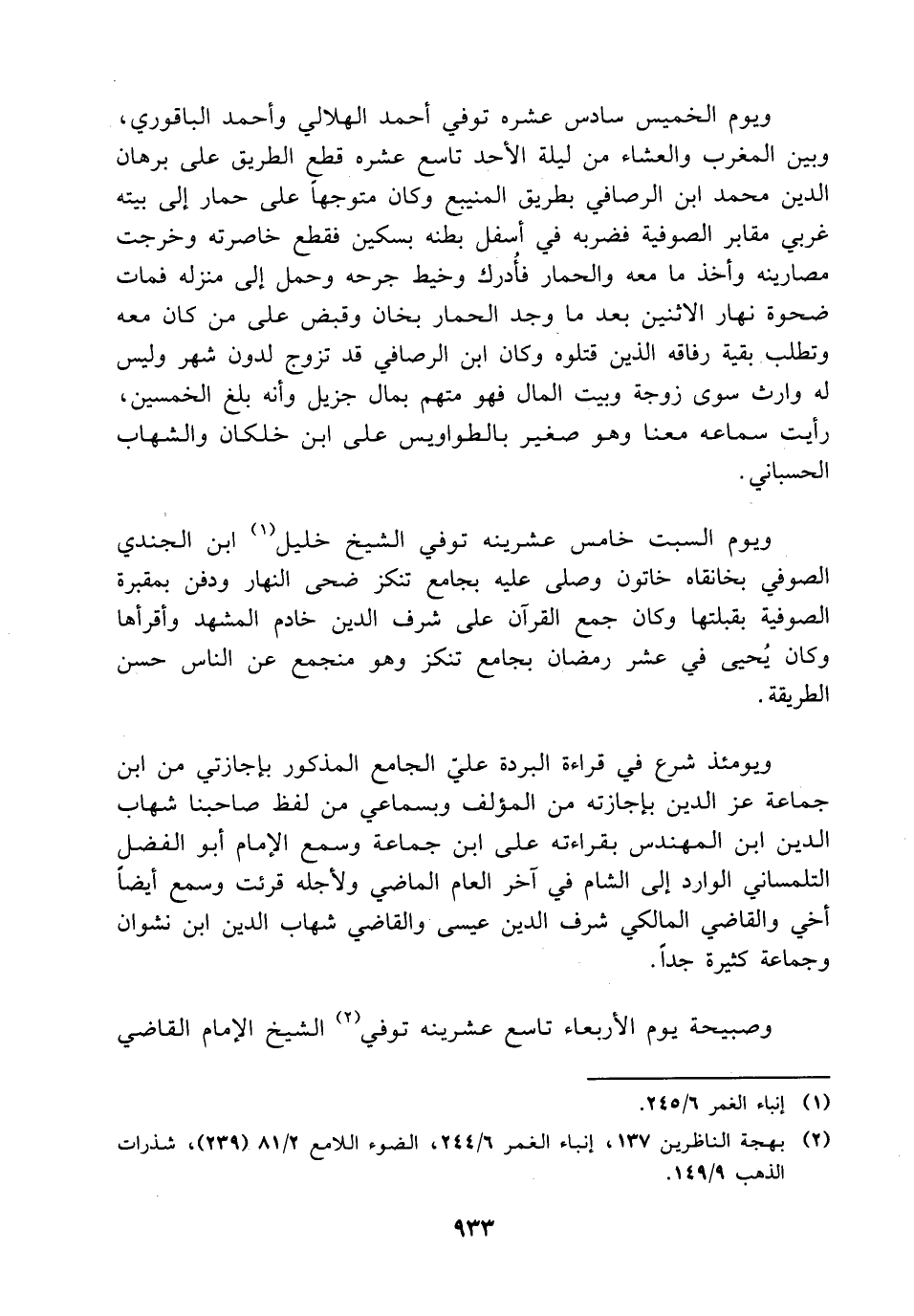 ويوم الخميس سادس عشره توفي أحمد الهلالي وأحمد الباقوري، وبين المغرب والعشاء من ليلة الأحد تاسع عشره قطع الطريق على برهان الدين محمد ابن الرصافي بطريق المنيبع وكان متوجهاً على حمار إلى بيته غربي مقابر الصوفية فضربه في أسفل بطنه بسكين فقطع خاصرته وخرجت مصارينه وأخذ ما معه والحمار فأُدرك وخيط جرحه وحمل إلى منزله فمات ضحوة نهار الاثنين بعد ما وجد الحمار بخان وقبض على من كان معه وتطلب. بقية رفاقه الذين قتلوه وكان ابن الرصافي قد تزوج لدون شهر وليس له وارث سوى زوجة وبيت المال فهو متهم بمال جزيل وأنه بلغ الخمسين، رأيت سماعه معنا وهو صغير بالطواويس على ابن خلكان والشهاب الحسباني.