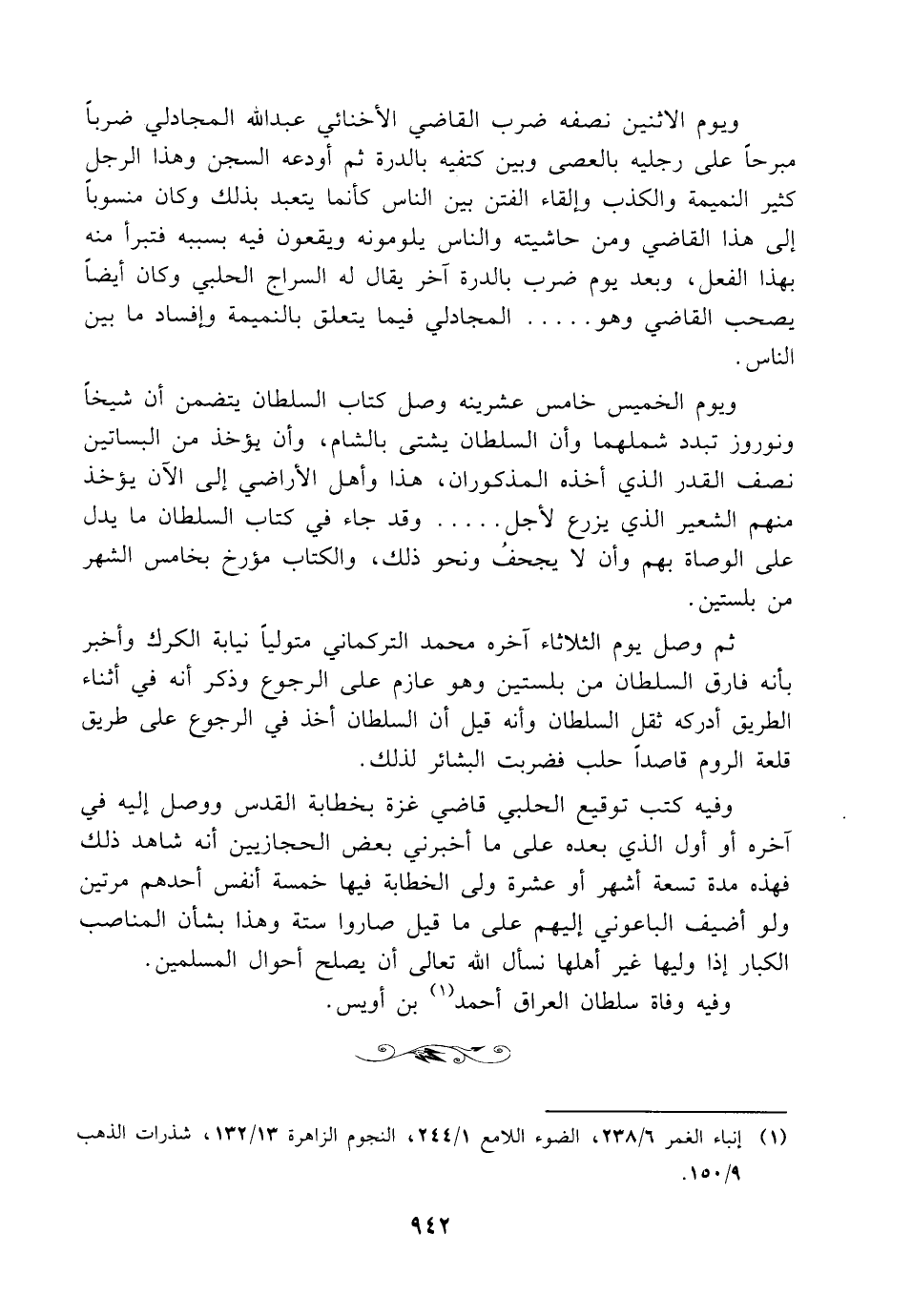 ويوم الخميس خامس عشرينه وصل كتاب السلطان يتضمن أن شيخاً ونوروز تبدد شملهما وأن السلطان يشتى بالشام، وأن يؤخذ من البساتين نصف القدر الذي أخذه المذكوران، هذا وأهل الأراضي إلى الآن يؤخذ منهم الشعير الذي يزرع لأجل ..... وقد جاء في كتاب السلطان ما يدل على الوصاة بهم وأن لا يجحفُ ونحو ذلك، والكتاب مؤرخ بخامس الشهر من بلستين.