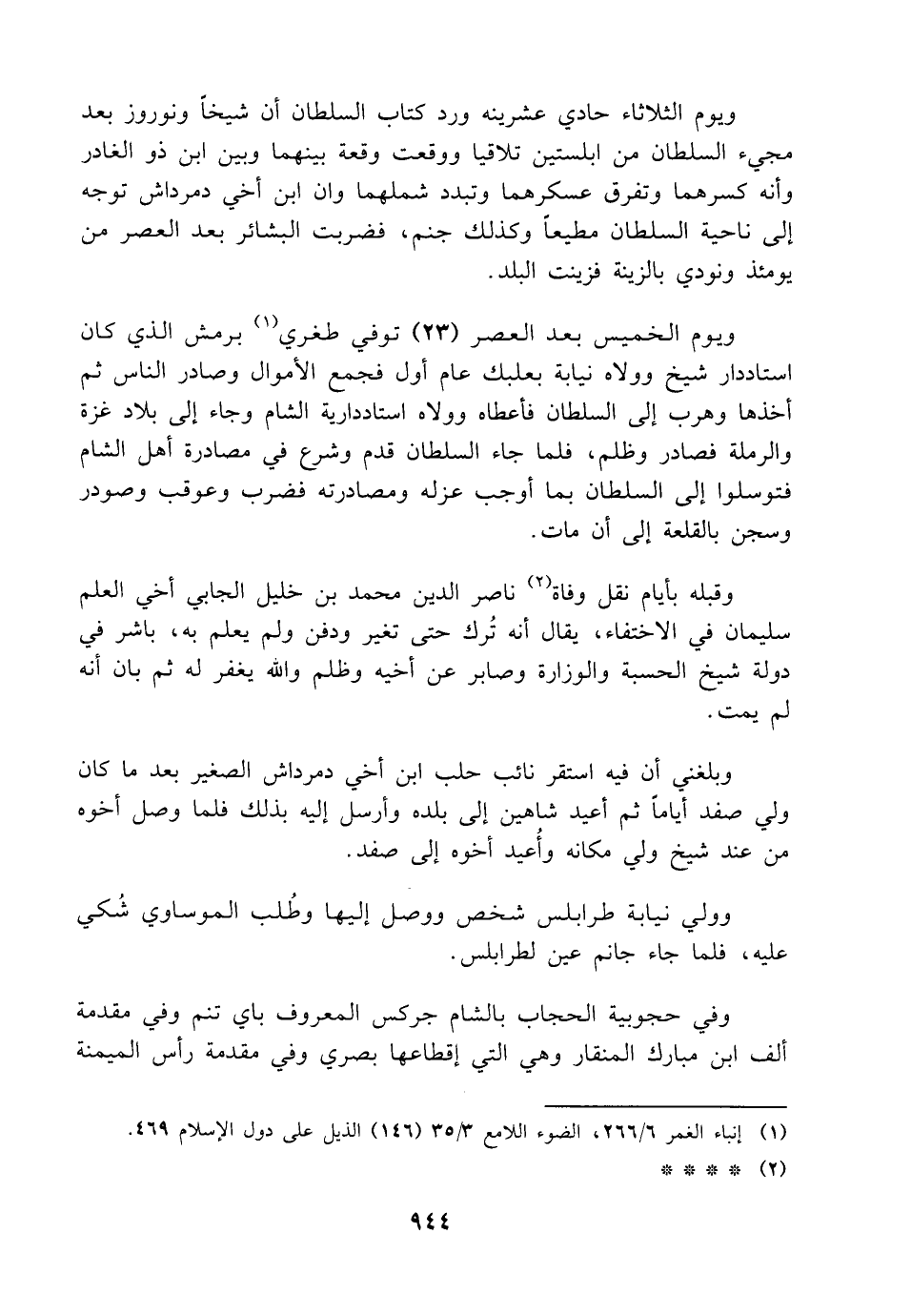 وبلغني أن فيه استقر نائب حلب ابن أخي دمرداش الصغير بعد ما كان ولي صفد أياماً ثم أعيد شاهين إلى بلده وأرسل إليه بذلك فلما وصل أخوه من عند شيخ ولي مكانه وأُعيد أخوه إلى صفد.