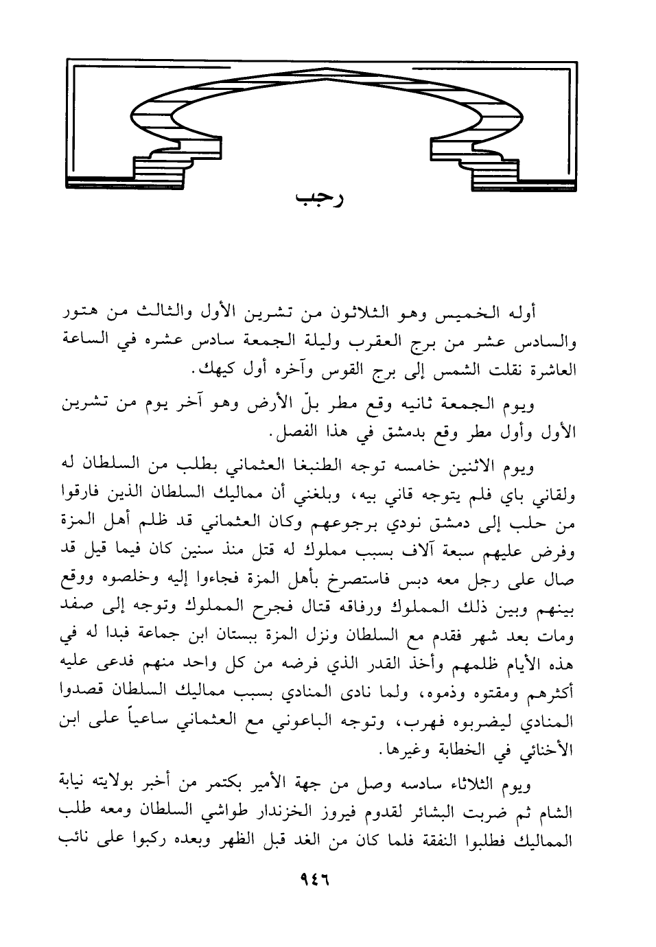 ويوم الاثنين خامسه توجه الطنبغا العثماني بطلب من السلطان له ولقاني باي فلم يتوجه قاني بيه، وبلغني أن مماليك السلطان الذين فارقوا من حلب إلى دمشق نودي برجوعهم وكان العثماني قد ظلم أهل المزة وفرض عليهم سبعة آلاف بسبب مملوك له قتل منذ سنين كان فيما قيل قد صال على رجل معه دبس فاستصرخ بأهل المزة فجاءوا إليه وخلصوه ووقع بينهم وبين ذلك المملوك ورفاقه قتال فجرح المملوك وتوجه إلى صفد ومات بعد شهر فقدم مع السلطان ونزل المزة ببستان ابن جماعة فبدا له في هذه الأيام ظلمهم وأخذ القدر الذي فرضه من كل واحد منهم فدعى عليه أكثرهم ومقتوه وذموه، ولما نادى المنادي بسبب مماليك السلطان قصدوا المنادي ليضربوه فهرب، وتوجه الباعوني مع العثماني ساعياً على ابن الأخنائي في الخطابة وغيرها.