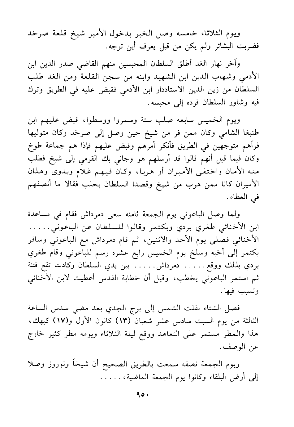 ويوم الجمعة نصفه سمعت بالطريق الصحيح أن شيخًا ونوروز وصلا إلى أرض البلقاء وكانوا يوم الجمعة الماضية، .....