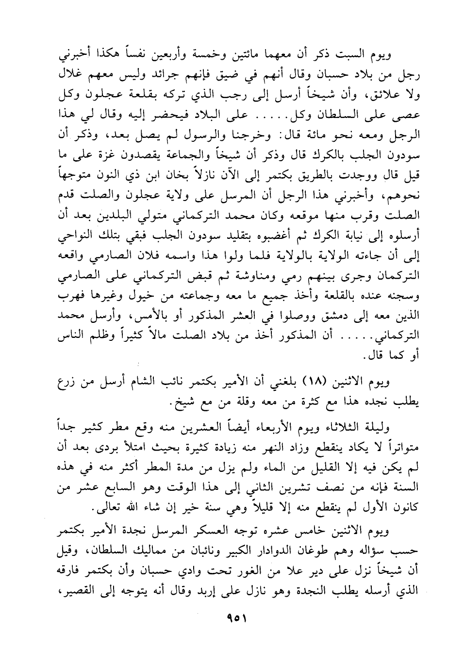 ويوم السبت ذكر أن معهما مائتين وخمسة وأربعين نفساً هكذا أخبرني رجل من بلاد حسبان وقال أنهم في ضيق فإنهم جرائد وليس معهم غلال ولا علائق، وأن شيخًا أرسل إلى رجب الذي تركه بقلعة عجلون وكل عصى على السلطان وكل ..... على البلاد فيحضر إليه وقال لي هذا الرجل ومعه نحو مائة قال: وخرجنا والرسول لم يصل بعد، وذكر أن سودون الجلب بالكرك قال وذكر أن شيخاً والجماعة يقصدون غزة على ما قيل يأتي ووجدت بالطريق بكتمر إلى الآن نازلاً بخان ابن ذي النون متوجهاً نحوهم، وأخبرني هذا الرجل أن المرسل على ولاية عجلون والصلت قدم الصلت وقرب منها موقعه وكان محمد التركماني متولي البلدين بعد أن أرسلوه إلى نيابة الكرك ثم أغضبوه بتقليد سودون الجلب فبقي بتلك النواحي إلى أن جاءته الولاية بالولاية فلما ولوا هذا واسمه فلان الصارمي واقعه التركمان وجرى بينهم رمي ومناوشة ثم قبض التركماني على الصارمي وسجنه عنده بالقلعة وأخذ جميع ما معه وجماعته من خيول وغيرها فهرب الذين معه إلى دمشق ووصلوا في العشر المذكور أو بالأمس، وأرسل محمد التركماني ..... أن المذكور أخذ من بلاد الصلت مالاً كثيرًا وظلم الناس أو كما قال.