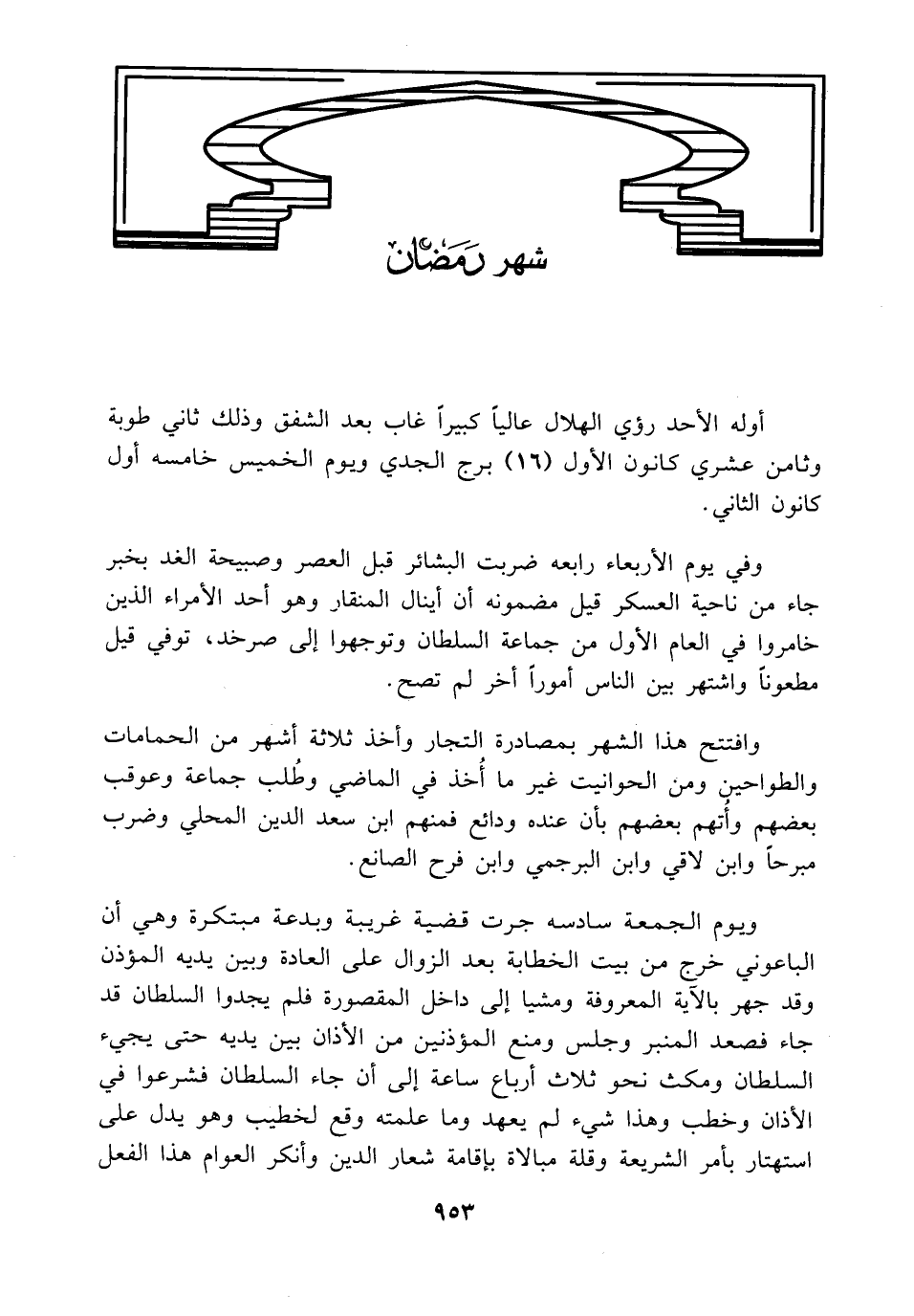 ويوم الجمعة سادسه جرت قضية غريبة وبدعة مبتكرة وهي أن الباعوني خرج من بيت الخطابة بعد الزوال على العادة وبين يديه المؤذن وقد جهر بالآية المعروفة ومشيا إلى داخل المقصورة فلم يجدوا السلطان قد جاء فصعد المنبر وجلس ومنع المؤذنين من الأذان بين يديه حتى يجيء السلطان ومكث نحو ثلاث أرباع ساعة إلى أن جاء السلطان فشرعوا في الأذان وخطب وهذا شيء لم يعهد وما علمته وقع لخطيب وهو يدل على استهتار بأمر الشريعة وقلة مبالاة بإقامة شعار الدين وأنكر العوام هذا الفعل