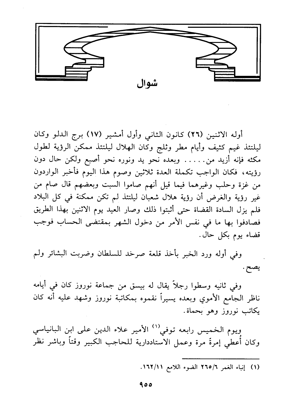 أوله الاثنين (26) كانون الثاني وأول أمشير (17) برج الدلو وكان ليلتئذ غيم كثيف وأيام مطر وثلج وكان الهلال ليلتئذ ممكن الرؤية لطول مكثه فإنه أزيد من ..... وبعده نحو يد ونوره نحو أصبع ولكن حال دون رؤيته، فكان الواجب تكملة العدة ثلاثين وصوم هذا اليوم فأخبر الواردون من غزة وحلب وغيرهما فيما قيل أنهم صاموا السبت وبعضهم قال صام من غير رؤية والغرض أن رؤية هلال شعبان ليلتئذ لم تكن ممكنة في كل البلاد فلم يزل السادة القضاة حتى أثبتوا ذلك وصار العيد يوم الاثنين بهذا الطريق فصادفوا بها ما في نفس الأمر من دخول الشهر بمقتضى الحساب فوجب قضاء يوم بكل حال.