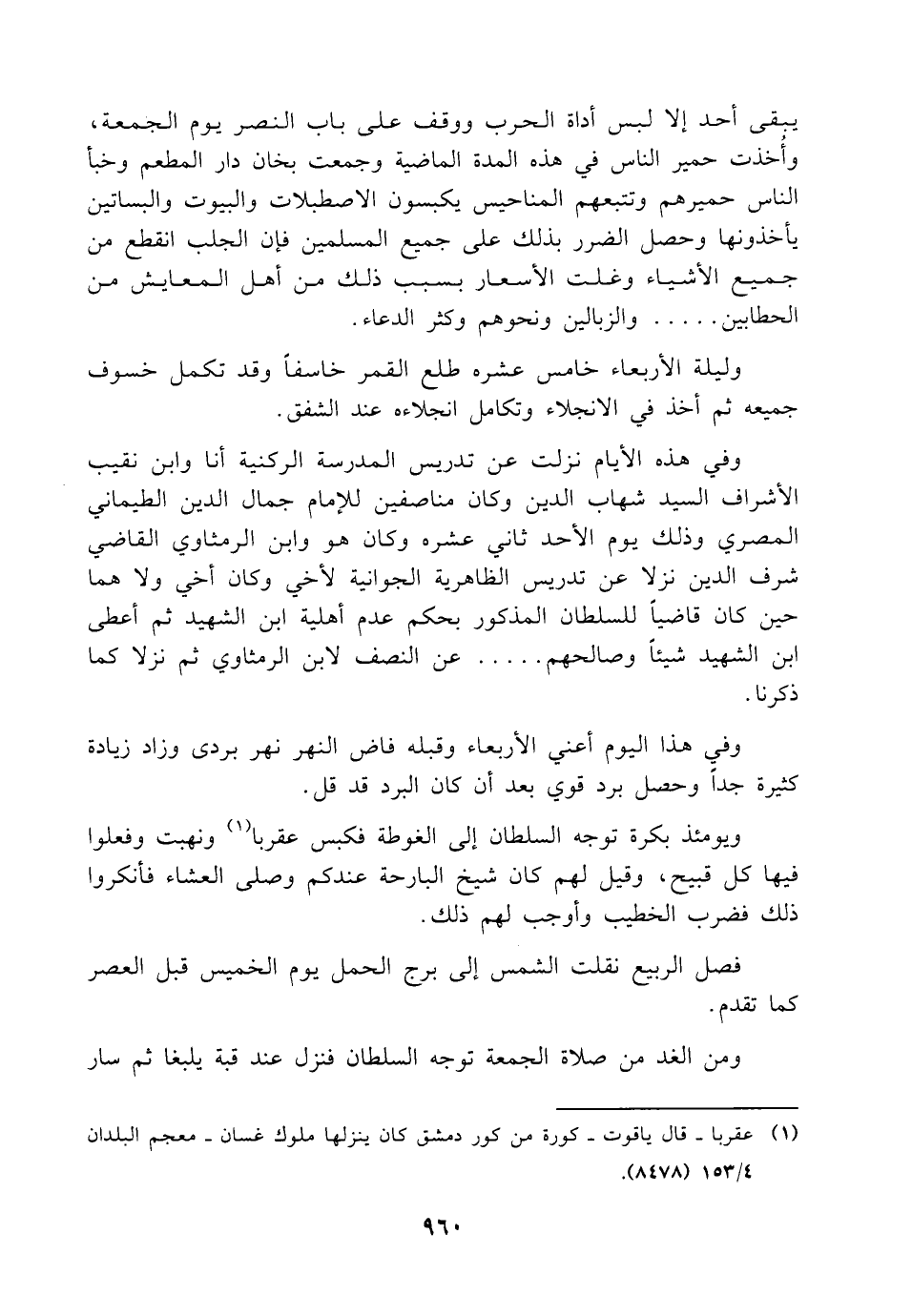 يبقى أحد إلا لبس أداة الحرب ووقف على باب النصر يوم الجمعة، وأُخذت حمير الناس في هذه المدة الماضية وجمعت بخان دار المطعم وخبأ الناس حميرهم وتتبعهم المناحيس يكبسون الاصطبلات والبيوت والبساتين يأخذونها وحصل الضرر بذلك على جميع المسلمين فإن الجلب انقطع من جميع الأشياء وغلت الأسعار بسبب ذلك من أهل المعايش من الحطابين ..... والزبالين ونحوهم وكثر الدعاء.