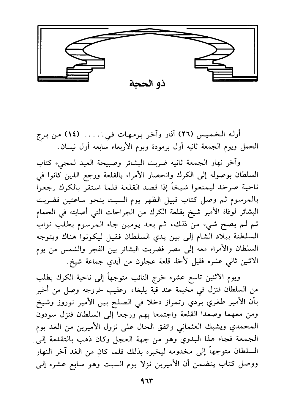 ويوم الاثنين تاسع عشره خرج النائب متوجهاً إلى ناحية الكرك بطلب من السلطان فنزل في مخيمة عند قبة يلبغا، وعقيب خروجه وصل من أخبر بأن الأمير طغري بردي وتمراز دخلا في الصلح بين الأمير نوروز وشيخ ومن معهما وصعدا القلعة واجتمعا بهم ورجعا إلى السلطان فنزل سودون المحمدي ويشبك العثماني واتفق الحال على نزول الأميرين من الغد يوم الجمعة فجاء هذا البدوي وهو من جهة العجل وكان ذهب بالتقدمة إلى السلطان متوجهاً إلى مخدومه ليخبره بذلك فلما كان من الغد آخر النهار ووصل كتاب يتضمن أن الأميرين نزلا يوم السبت وهو سابع عشره إلى