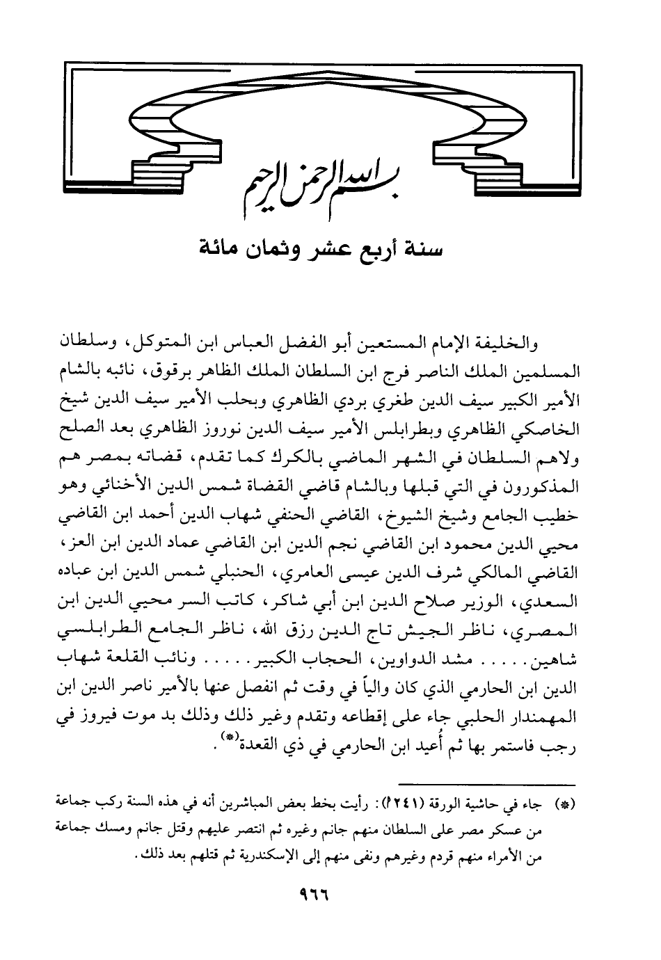 (*) جاء في حاشية الورقة (241 أ): رأيت بخطِّ بعض المباشرين أنه في هذه السنة ركب جماعة من عسكر مصر على السلطان منهم جانم وغيره ثم انتصر عليهم وقتل جانم ومسك جماعة من الأمراء منهم قردم وغيرهم ونفى منهم إلى الإسكندرية ثم قتلهم بعد ذلك.