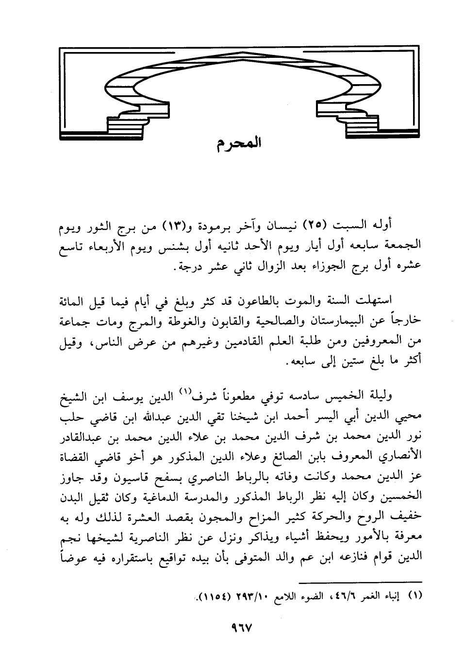 استهلت السنة والموت بالطاعون قد أكثر وبلغ في أيام فيما قيل المائة خارجاً عن البيمارستان والصالحية والقابون والغوطة والمرج ومات جماعة من المعروفين ومن طلحة العلم القادمين وغيرهم من عرض الناس، وقيل أكثر ما بلغ ستين إلى سابعه.