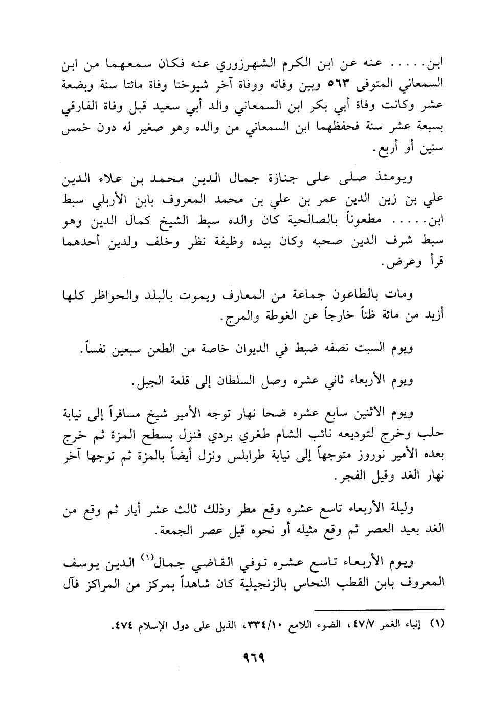 ابن ..... عنه عن ابن الكرم الشهرزوري عنه فكان سمعهما من ابن السمعاني المتوفى 563 وبين وفاته ووفاة آخر شيوخنا وفاة مائتا سنة وبضعة عشر وكانت وفاة أبي بكر ابن السمعاني والد أبي سعيد قبل وفاة الفارقي بسبعة عشر سنة فحفظهما ابن السمعاني من والده وهو صغير له دون خمس سنين أو أربع.