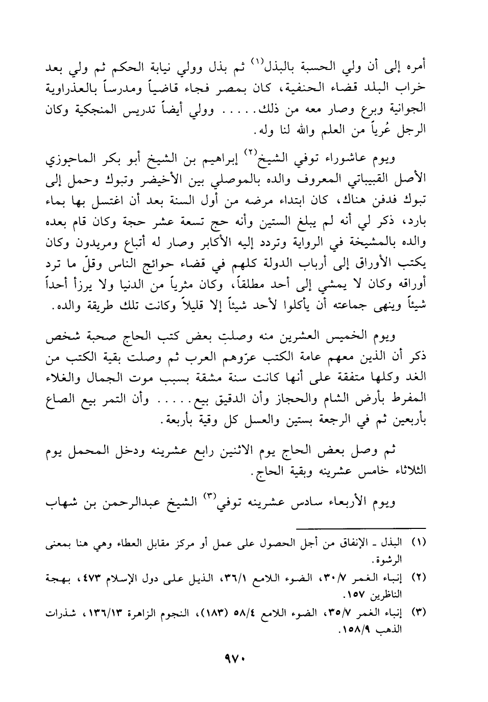 ويوم عاشوراء توفي الشيخ (¬2) إبراهيم بن الشيخ أبو بكر الماجوزي الأصل القبيباتي المعروف والده بالموصلي بين الأخيضر وتبوك وحمل إلى تبوك فدفن هناك، كان ابتداء مرضه من أول السنة بعد أن اغتسل بها بماء بارد، ذكر لي أنه لم يبلغ الستين وأنه حج تسعة عشر حجة وكان قام بعده والده بالمشيخة في الرواية وتردد إليه الأكابر وصار له أتباع ومريدون وكان يكتب الأوراق إلى أرباب الدولة كلهم في قضاء حوائج الناس وقلّ ما ترد أوراقه وكان لا يمشي إلى أحد مطلقاً، وكان مثرياً من الدنيا ولا يرزأ أحداً شيئاً وينهى جماعته أن يأكلوا لأحد شيئاً إلا قليلاً وكانت تلك طريقة والده.