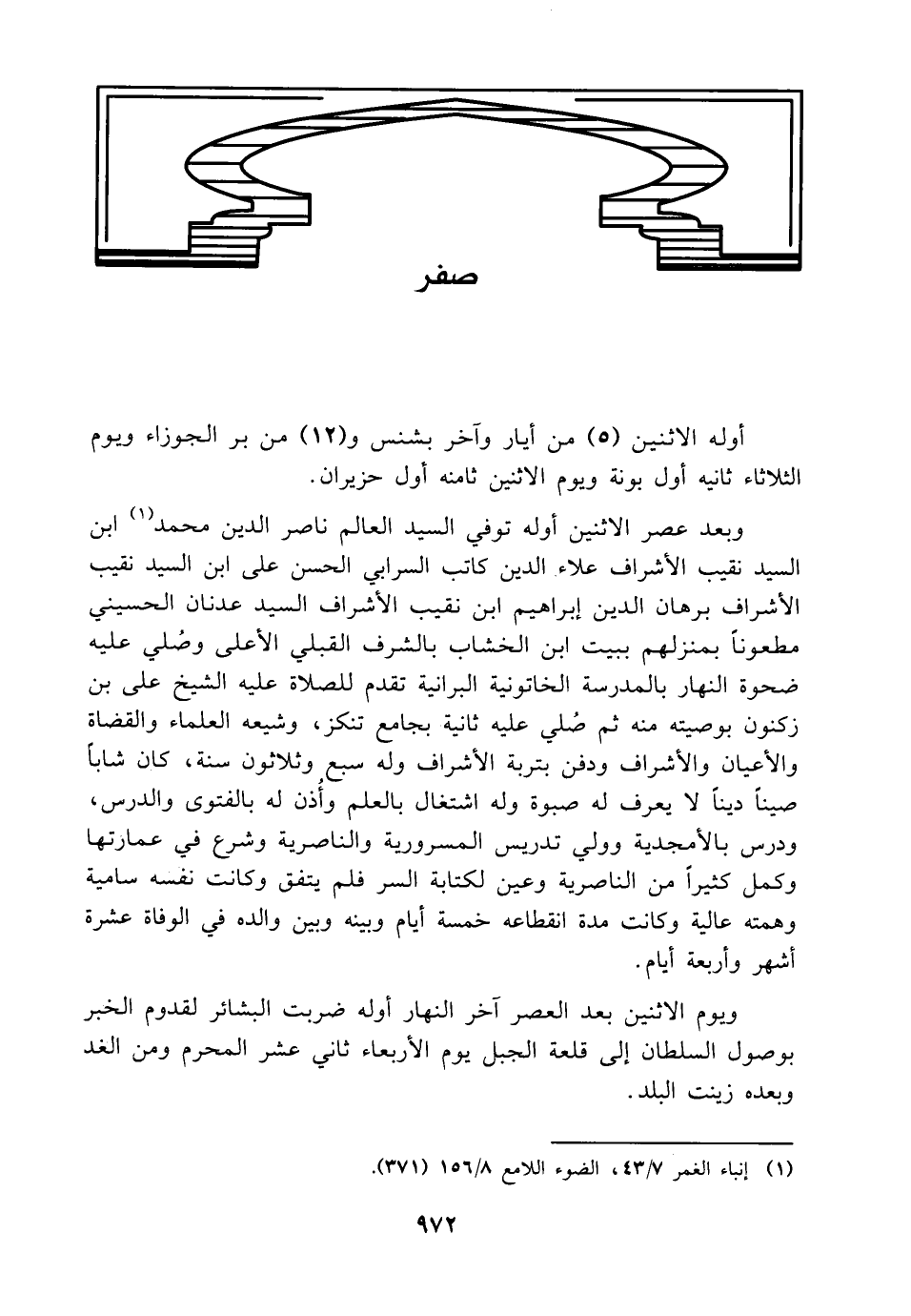وبعد عصر الاثنين أوله توفي السيد العالم ناصر الدين محمد (¬1) ابن السيد نقيب الأشراف علاء. الدين كاتب السرابي الحسن على ابن السيد نقيب الأشراف برهان الدين إبراهيم ابن نقيب الأشراف السيد عدنان الحسيني مطعوناً بمنزلهم ببيت ابن الخشاب بالشرف القبلي الأعلى وصُلي عليه ضحوة النهار بالمدرسة الخاتونية البرانية تقدم للصلاة عليه الشيخ علي بن زكنون بوصيته منه ثم صُلي عليه ثانية بجامع تنكز، وشيعه العلماء والقضاة والأعيان والأشراف ودفن بتربة الأشراف وله سبع وثلاثون سنة، كان شاباً صيناً ديناً لا يعرف له صبوة وله اشتغال بالعلم وأُذن له بالفتوى والدرس، ودرس بالأمجدية وولي تدريس المسرورية والناصرية وشرع في عمارتها وكمل كثيراً من النَّاصرية وعين لكتابة السر فلم يتفق وكانت نفسه سامية وهمته عالية وكانت مدة انقطاعه خمسة أيام وبينه وبين والده في الوفاة عشرة أشهر وأربعة أيام.