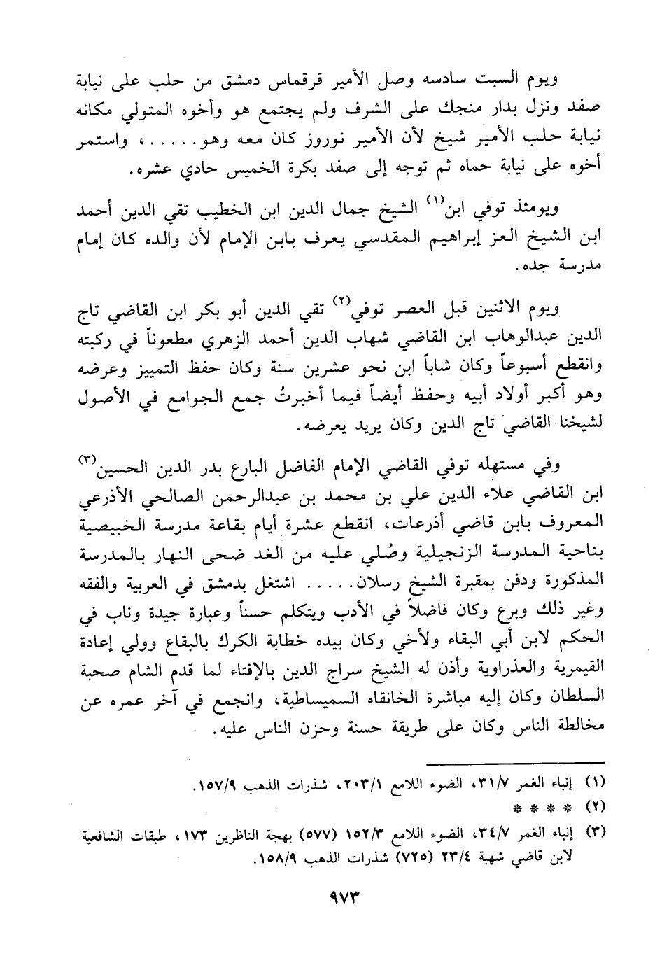 وفي مستهله توفي القاضي الإمام الفاضل البارع بدر الدين الحسين (¬3) ابن القاضي علاء الدين علي بن محمد بن عبد الرحمن الصالحي الأذرعي المعروف بابن قاضي أذرعات، انقطع عشرة أيام بقاعة مدرسة الخبيصية بناحية المدرسة الزنجيلية وصُلي عليه من الغد ضحى النهار بالمدرسة المذكورة ودفن بمقبرة الشيخ رسلان ..... اشتغل بدمشق في العربية والفقه وغير ذلك وبرع وكان فاضلاً في الأدب ويتكلم حسناً وعبارة جيدة وناب في الحكم لابن أبي البقاء ولأخي وكان بيده خطابة الكرك بالبقاع وولي إعادة القيمرية والعذراوية وأذن له الشيخ سراج الدين بالإفتاء لما قدم الشام صحبة السلطان وكان إليه مباشرة الخانقاه السميساطية، وانجمع في آخر عمره عن مخالطة الناس وكان على طريقة حسنة وحزن الناس عليه.