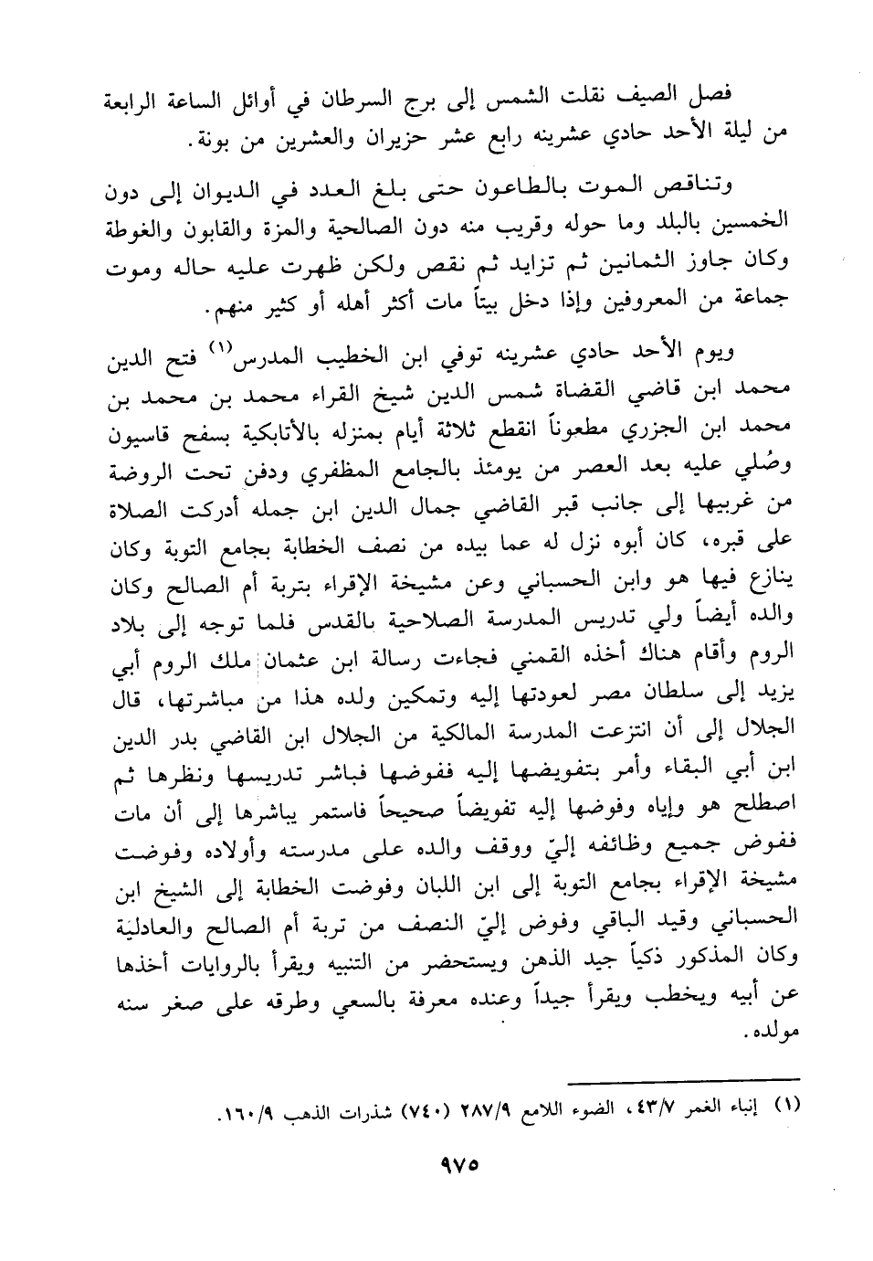 ويوم الأحد حادي عشرينه توفي ابن الخطيب المدرس (¬1) فتح الدين محمد ابن قاضي القضاة شمس الدين شيخ القراء محمد بن محمد بن محمد ابن الجزري مطعوناً انقطع ثلاثة أيام بمنزله بالأتابكية بسفح قاسيون وصُلي عليه بعد العصر من يومئذ بالجامع المظفري ودفن تحت الروضة من غربيها إلى جانب قبر القاضي جمال الدين ابن جمله أدركت الصلاة على قبره، كان أبوه نزل له عما بيده من نصف الخطابة بجامع التوبة وكان ينازع فيها هو وابن الحسباني وعن مشيخة الإقراء بتربة أم الصالح وكان والده أيضاً ولي تدريس المدرسة الصلاحية بالقدس فلما توجه إلى بلاد الروم وأقام هناك أخذه القمني فجاءت رسالة ابن عثمان ملك الروم أبي يزيد إلى سلطان مصر لعودتها إليه وتمكين ولده هذا من مباشرتها، قال الجلال إلى أن انتزعت المدرسة المالكية من الجلال ابن القاضي بدر الدين ابن أبي البقاء وأمر بتفويضها إليه ففوضها فباشر تدريسها ونظرها ثم اصطلح هو وإياه وفوضها إليه تفويضاً صحيحًا فاستمر يباشرها إلى أن مات ففوض جميع وظائفه إليّ ووقف والده على مدرسته وأولاده وفوضت مشيخة الإقراء بجامع التوبة إلى ابن اللبان وفوضت الخطابة إلى الشيخ ابن الحسباني وقيد الباقي وفوض إليّ النصف من تربة أم الصالح والعادلية وكان المذكور ذكياً جيد الذهن ويستحضر من التنبيه ويقرأ بالروايات أخذها عن أبيه ويخطب ويقرأ جيداً وعنده معرفة بالسعي وطرقه على صغر سنه مولده.