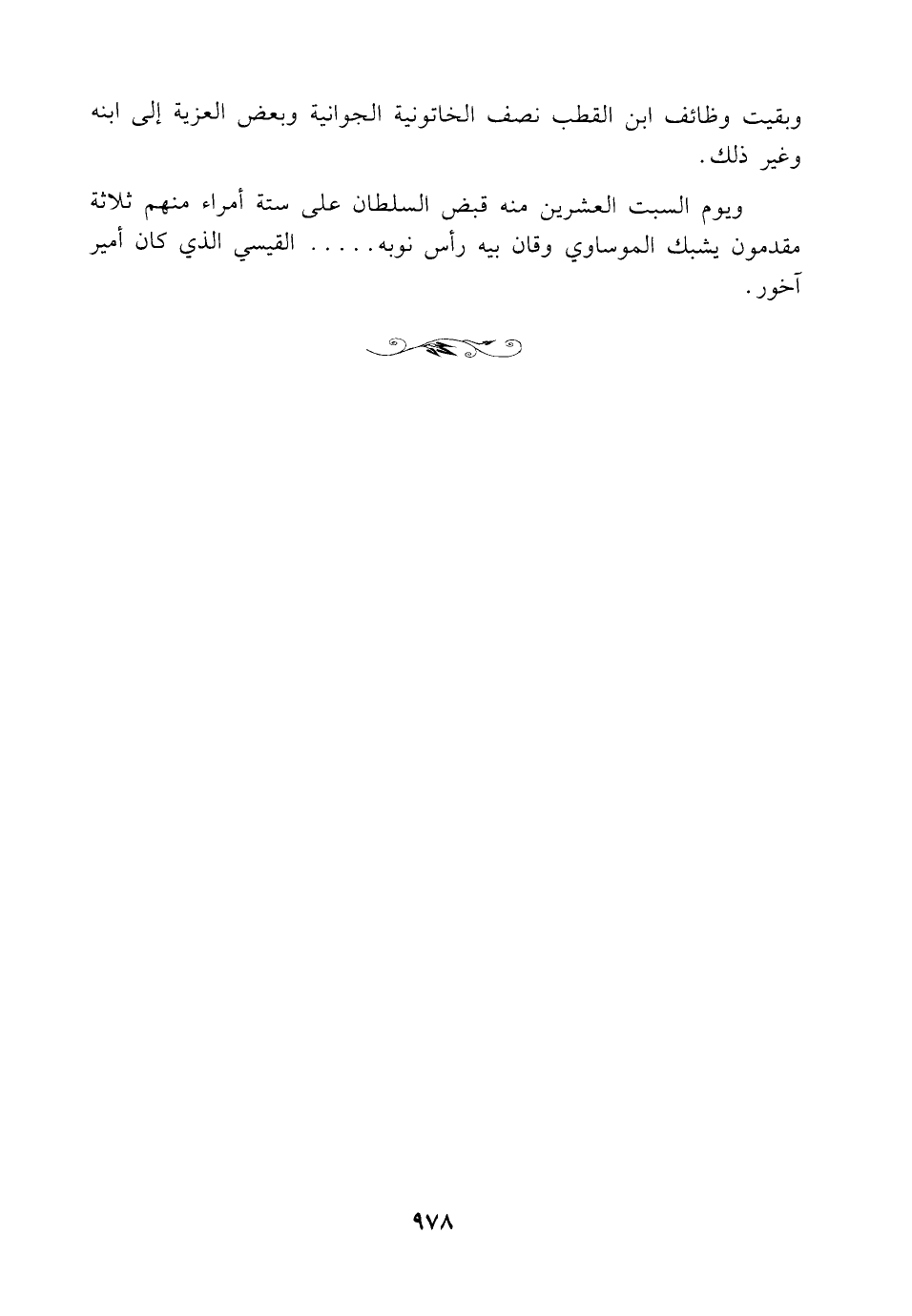 وبقيت وظائف ابن القطب نصف الخاتونية الجوانية وبعض العزية إلى ابنه وغير ذلك.