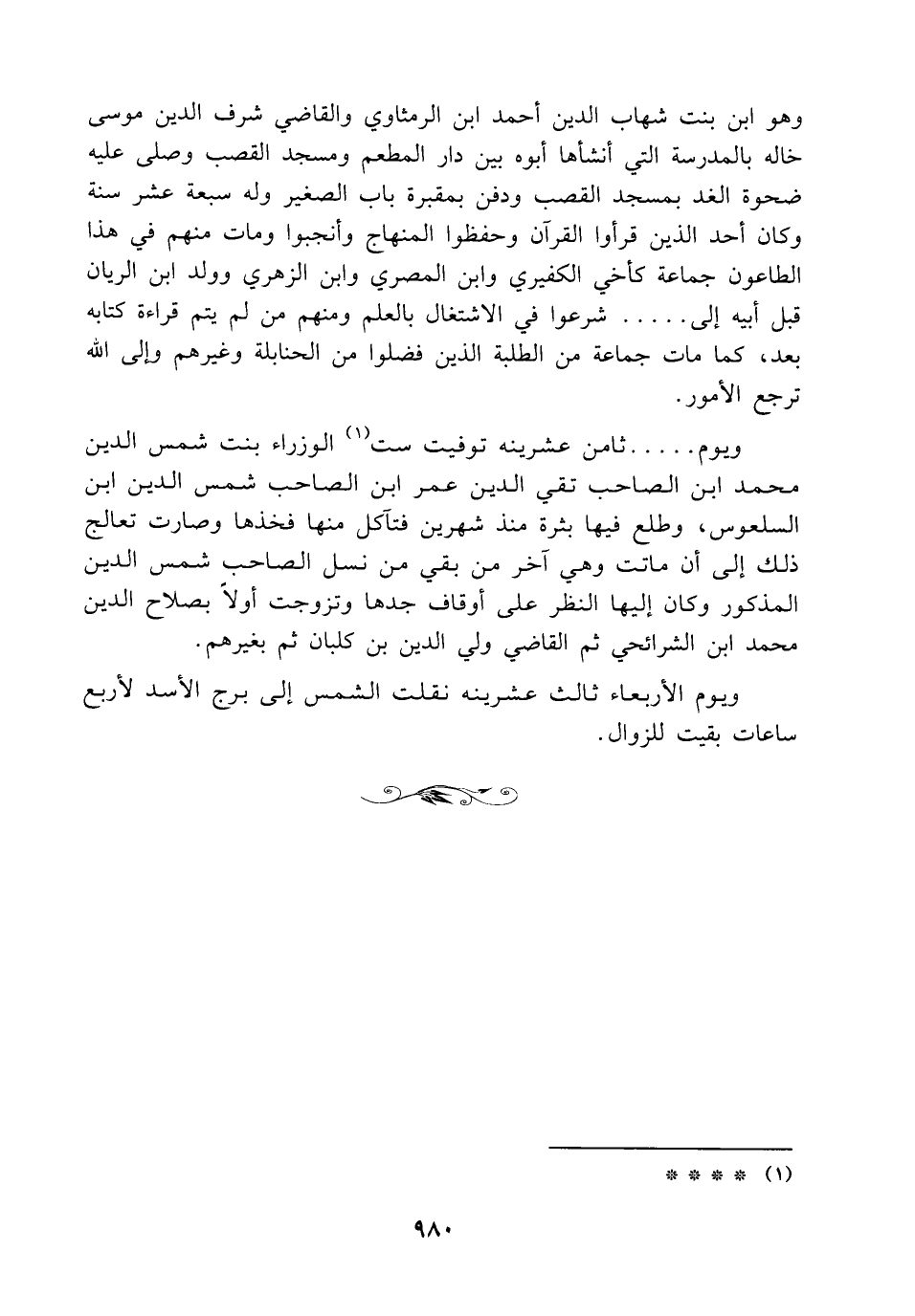 ويوم ..... ثامن عشرينه توفيت ست (¬1) الوزراء بنت شمس الدين محمد ابن الصاحب تقي الدين عمر ابن الصاحب شمس الدين ابن السلعوس، وطلع فيها بثرة منذ شهرين فتآكل منها فخذها وصارت تعالج ذلك إلى أن ماتت وهي آخر من بقي من نسل الصاحب شمس الدين المذكور وكان إليها النظر على أوقاف جدها وتزوجت أولاً بصلاح الدين محمد ابن الشرائحي ثم القاضي ولي الدين بن كلبان ثم بغيرهم.