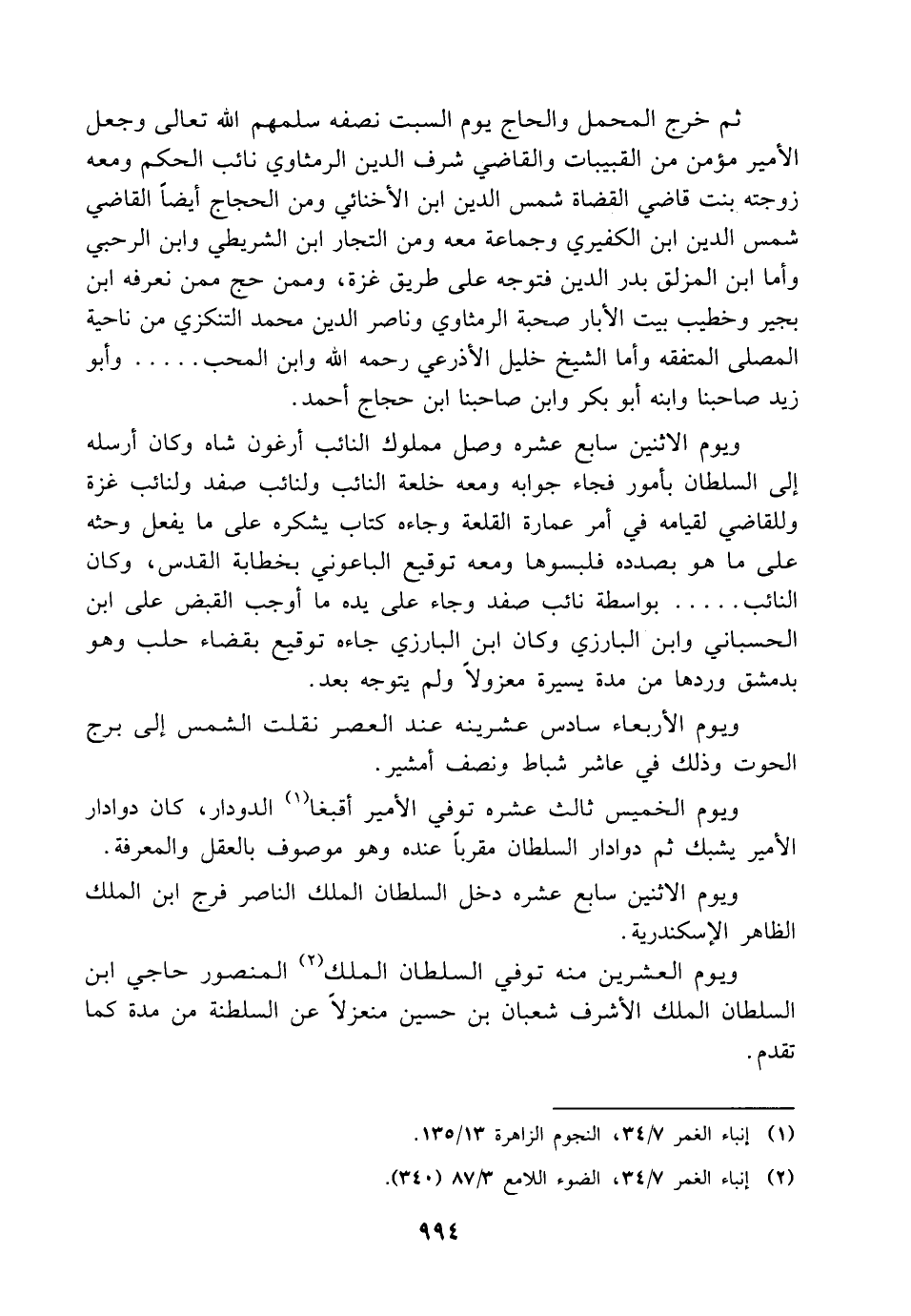 ويوم الاثنين سابع عشره وصل مملوك النائب أرغون شاه وكان أرسله إلى السلطان بأمور فجاء جوابه ومعه خلعة النائب ولنائب صفد ولنائب غزة وللقاضي لقيامه في أمر عمارة القلعة وجاءه كتاب يشكره على ما يفعل وحثه على ما هو بصدده فلبسوها ومعه توقيع الباعوني بخطابة القدس، وكان النائب ..... بواسطة نائب صفد وجاء على يده ما أوجب القبض على ابن الحسباني وابن البارزي وكان ابن البارزي جاءه توقيع بقضاء حلب وهو بدمشق وردها من مدة يسيرة معزولاً ولم يتوجه بعد.