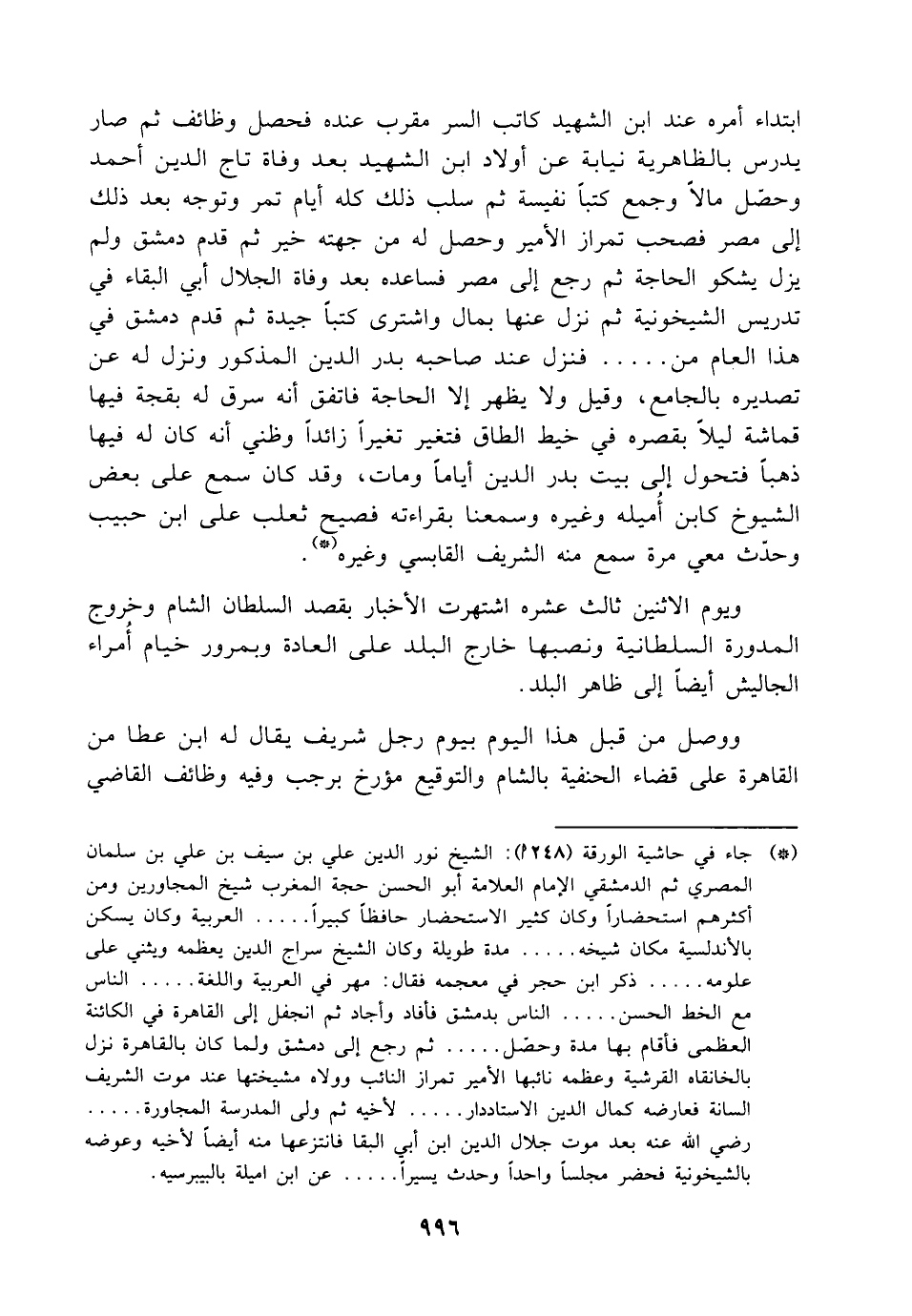 (*) جاء في حاشية الورقة (248 أ): الشيخ نور الدين علي بن سيف بن علي بن سلمان المصري ثم الدّمشقيُّ الإمام العلامة أبو الحسن حجة المغرب شيخ المجاورين ومن أكثرهم استحضاراً وكان كثير الاستحضار حافظاً كبيراً ..... العربية وكان يسكن بالأندلسية مكان شيخه ..... مدة طويلة وكان الشيخ سراج الدين يعظمه ويثني على علومه ..... ذكر ابن حجر في معجمه فقال: مهر في العربية واللغة ..... الناس مع الخط الحسن ..... الناس بدمشق فأفاد وأجاد ثم انجفل إلى القاهرة في الكائنة العظمى فأقام بها مدة وحصَّل ..... ثم رجع إلى دمشق ولما كان بالقاهرة نزل بالخانقاه القرشية وعظمه نائبها الأمير تمراز النائب وولاه مشيختها عند موت الريف السانة فعارضه كمال الدين الاستاددار ..... لأخيه ثم ولى المدرسة المجاورة ..... رضي الله عنه بعد موت جلال الدين ابن أبي البقا فانتزعها منه أيضاً لأخيه وعوضه بالشخونية فحضر مجلساً واحداً وحدث يسيراً ..... عن ابن اميلة بالبيبرسيه.