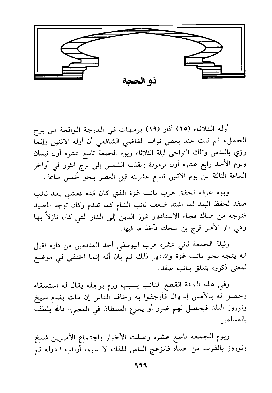 وفي هذه المدة انقطع النائب بسبب ورم برجله يقال له استسقاء وحصل له بالأمس إسهال فأرجفوا به وخاف الناس إن مات يقدم شيخ ونوروز البلد فيحصل لهم ضرر أو يسرع السلطان في المجيء فالله يلطف بالمسلمين.