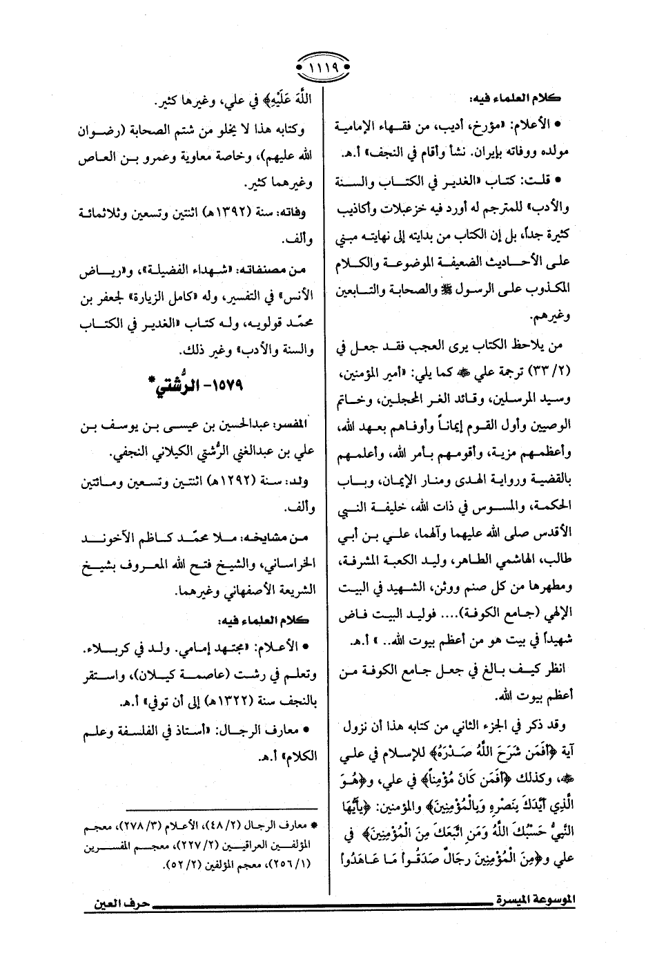 * الأعلام: "مؤرخ، أديب، من فقهاء الإمامية مولده ووفاته بإيران. نشأ وأقام في النجف" أ. هـ.