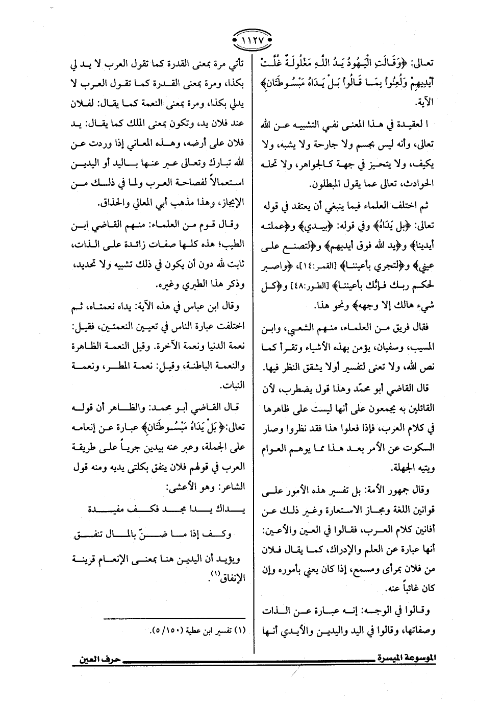 قال القاضي أبو محمد: والظاهر أن قوله تعالى: {بَلْ يَدَاهُ مَبسُوطَتَانِ} عبارة عن إنعامه على الجملة، وعبر عنه بيدين جريًا على طريقة العرب في قولهم فلان ينفق بكلتى يديه ومنه قول الشاعر: وهو الأعشى: