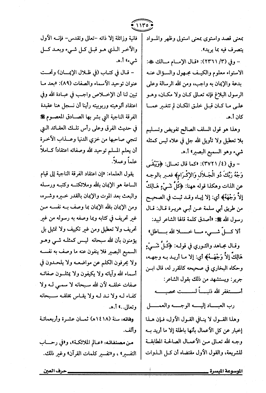 - وفي (4/ 3721): "كما قال تعالى: {وَيَبْقَى وَجهُ رَبِّكَ ذو الْجَلالِ وَالإكِرَام} فعبر بالوجه عن الذات وهكذا قوله ها هنا: {كلُّ شَيءٍ هَالِكٌ إلا وَجْهَهُ} أي: إلا إياه وقد ثبت في الصحيح من طريق أبي سلمة عن أبي هريرة قال: قال رسول الله - صلى الله عليه وسلم -: "أصدق كلمة قالها الشاعر لبيد: