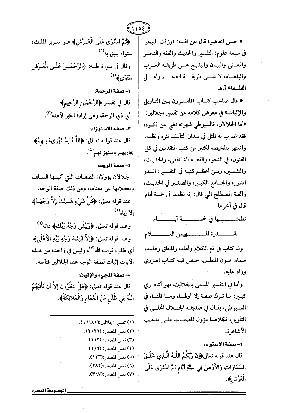 وأما في التفسير المسمى بالجلالين، فهو أشعري كبير، ما ترك صفة إلا أولها، وما قلناه في السيوطي، يقال في صديقه الجلال المحلى في التأويل، فكلاهما مؤول للصفات على مذهب الأشاعرة.
