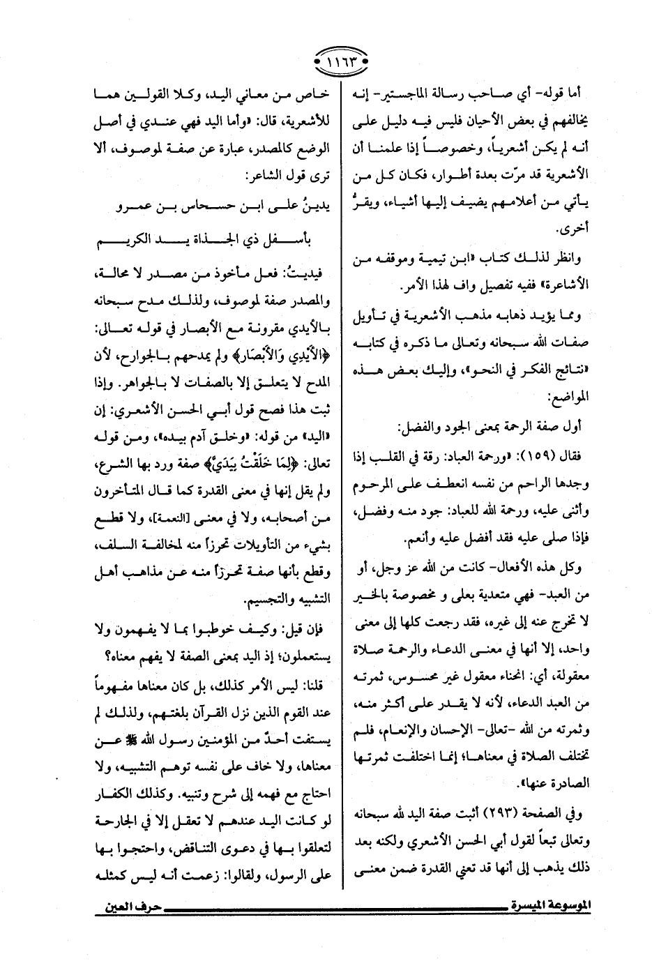 وفي الصفحة (293) أثبت صفة اليد لله سبحانه وتعالى تبعًا لقول أبي الحسن الأشعري ولكنه بعد ذلك يذهب إلى أنها قد تعني القدرة ضمن معنى خاص من معاني اليد، وكلا القولين هما للأشعرية، قال: "وأما اليد فهي عندي في أصل الوضع كالمصدر، عبارة عن صفة لموصوف، ألا ترى قول الشاعر: