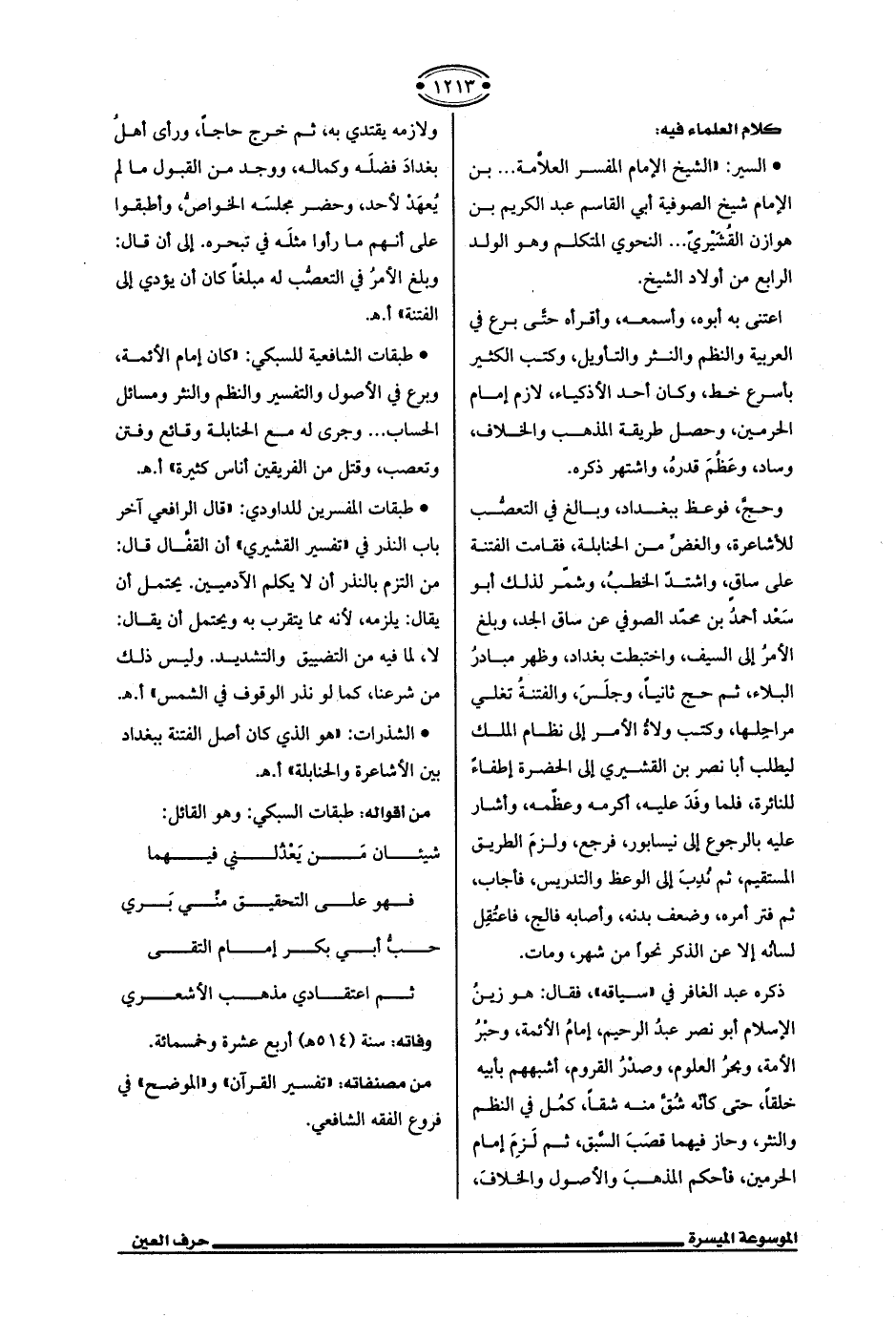 • السير: "الشيخ الإمام المفسر العلامة. . . بن الإمام شيخ الصوفية أبي القاسم عبد الكريم بن هوازن القُشَيري. . . النحوي المتكلم وهو الولد الرابع من أولاد الشيخ.