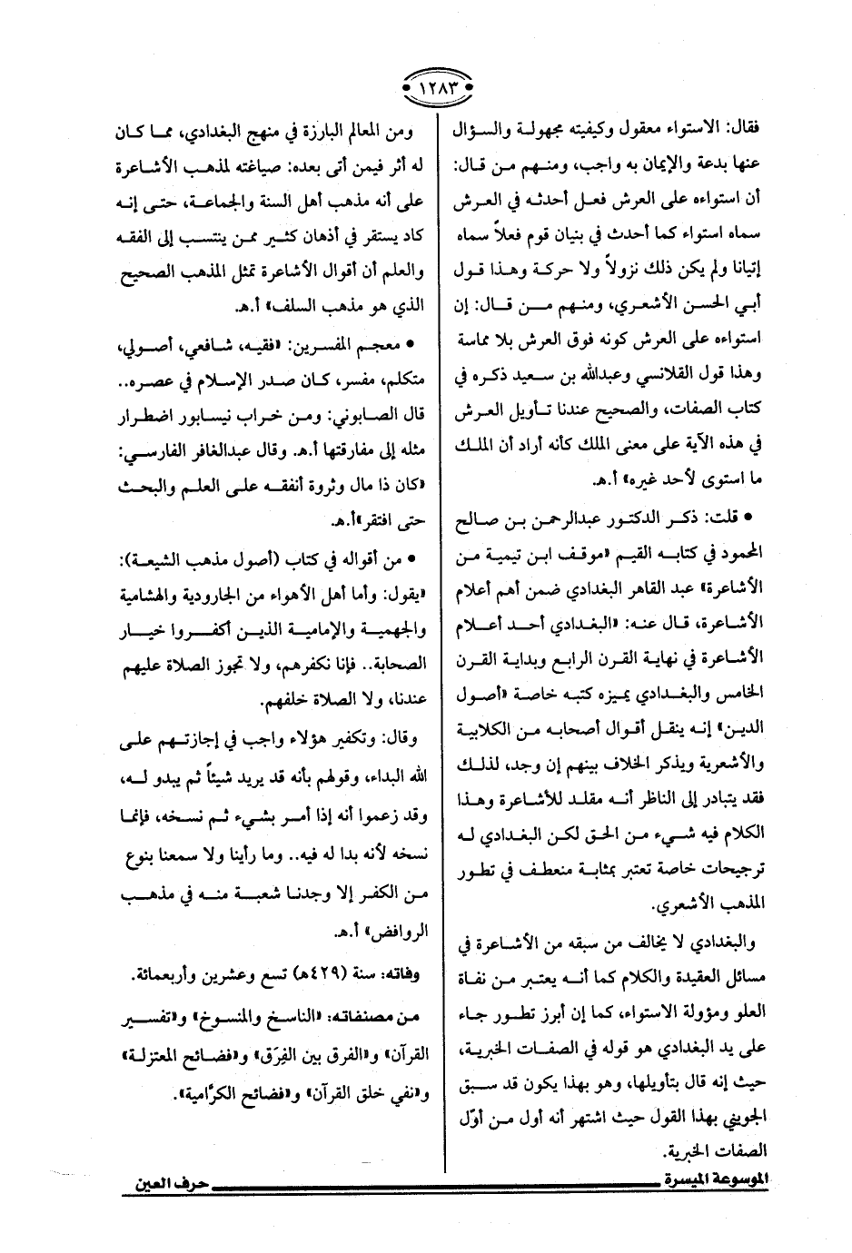 * قلت: ذكر الدكتور عبد الرحمن بن صالح المحمود في كتابه القيم "موقف ابن تيمية من الأشاعرة" عبد القاهر البغدادي ضمن أهم أعلام الأشاعرة، قال عنه: "البغدادي أحد أعلام الأشاعرة في نهاية القرن الرابع وبداية القرن الخامس والبغدادي يميزه كتبه خاصة "أصول الدين" إنه ينقل أقوال أصحابه من الكلابية والأشعرية ويذكر الخلاف بينهم إن وجد، لذلك فقد يتبادر إلى الناظر أنه مقلد للأشاعرة وهذا الكلام فيه شيء من الحق لكن البغدادي له ترجيحات خاصة تعتبر بمثابة منعطف في تطور المذهب الأشعري.