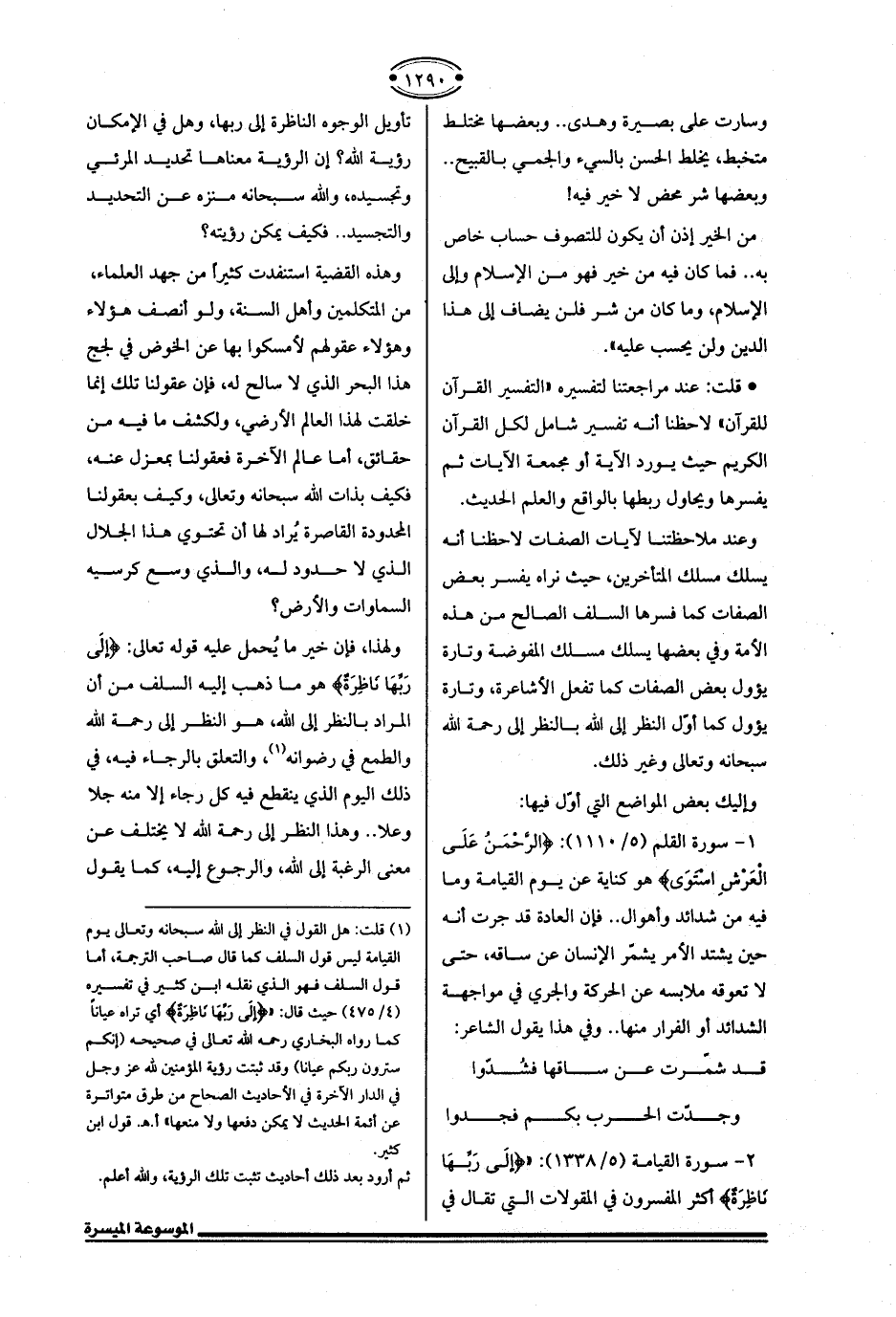 (¬1) قلت: هل القول في النظر إلى الله سبحانه وتعالى يوم القيامة ليس قول السلف كلما قال صاحب الترجمة، أما قول السلف فهو الذي نقله ابن كثير في تفسيره (4/ 475) حيت قال: " {إِلَى رَبِّهَا نَاظِرَةٌ} أي تراه عيانًا كما رواه البخاري رحمه الله تعالى في صحيحه (إنكم سترون ربكم عيانا) وقد ثبتت رؤية المؤمنين لله عزَّ وجلَّ في الدار الآخرة في الأحاديث الصحاح من طرق متواترة عن أئمة الحديث لا يمكن دفعها ولا منعها" أ. كل. قول ابن كثير.