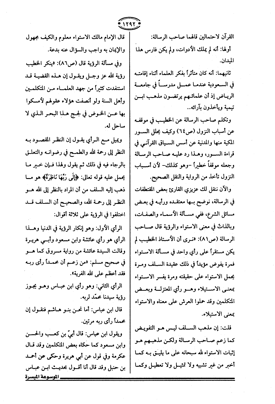 وفي مسألة الرؤية قال (ص 86): "ينكر الخطيب رؤية الله عزَّ وجلَّ ويقول إن هذه القضية قد استنفدت كثيرًا من جهد العلماء من المتكلمين وأهل السنة ولو أنصفت هؤلاء عقولهم لأمسكوا بها عن الخوض في لجج هذا البحر الذي لا ساحل له.