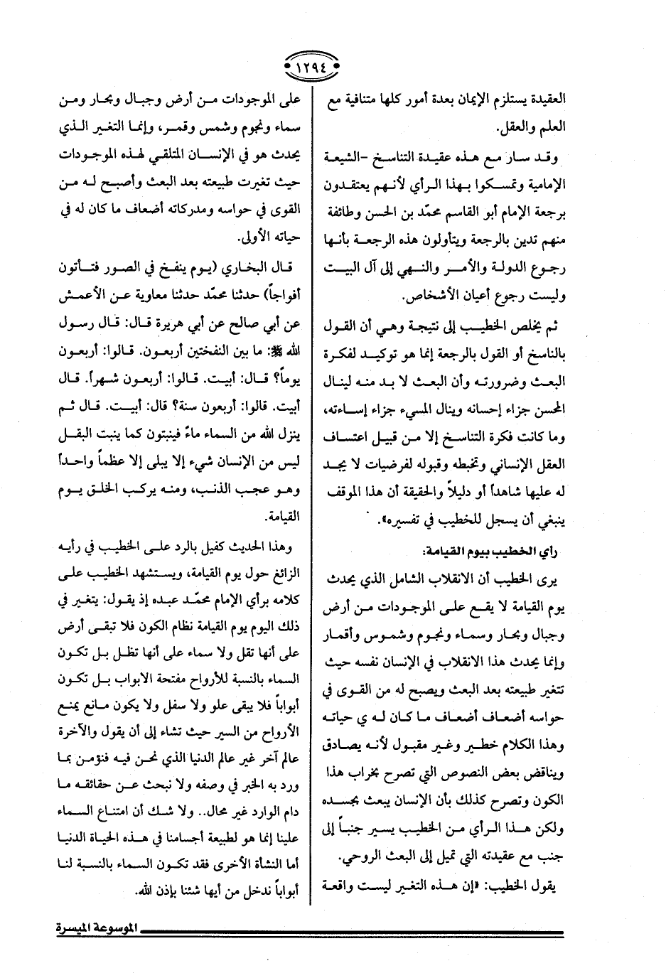يرى الخطيب أن الانقلاب الشامل الذي يحدث يوم القيامة لا يقع على الموجودات من أرض وجبال وبحار وسماء ونجوم وشموس وأقمار وإنما يحدث هذا الانقلاب في الإنسان نفسه حيث تتغير طبيعته بعد البعث ويصبح له من القوى في حواسه أضعاف أضعاف ما كان له في حياته وهذا الكلام خطير وغير مقبول لأنه يصادق ويناقض بعض النصوص التي تصرح بخراب هذا الكون وتصرح كذلك بأن الإنسان يبعث بجسده ولكن هذا الرأي من الخطيب يسير جنبًا إلى جنب مع عقيدته التي تميل إلى البعث الروحي.