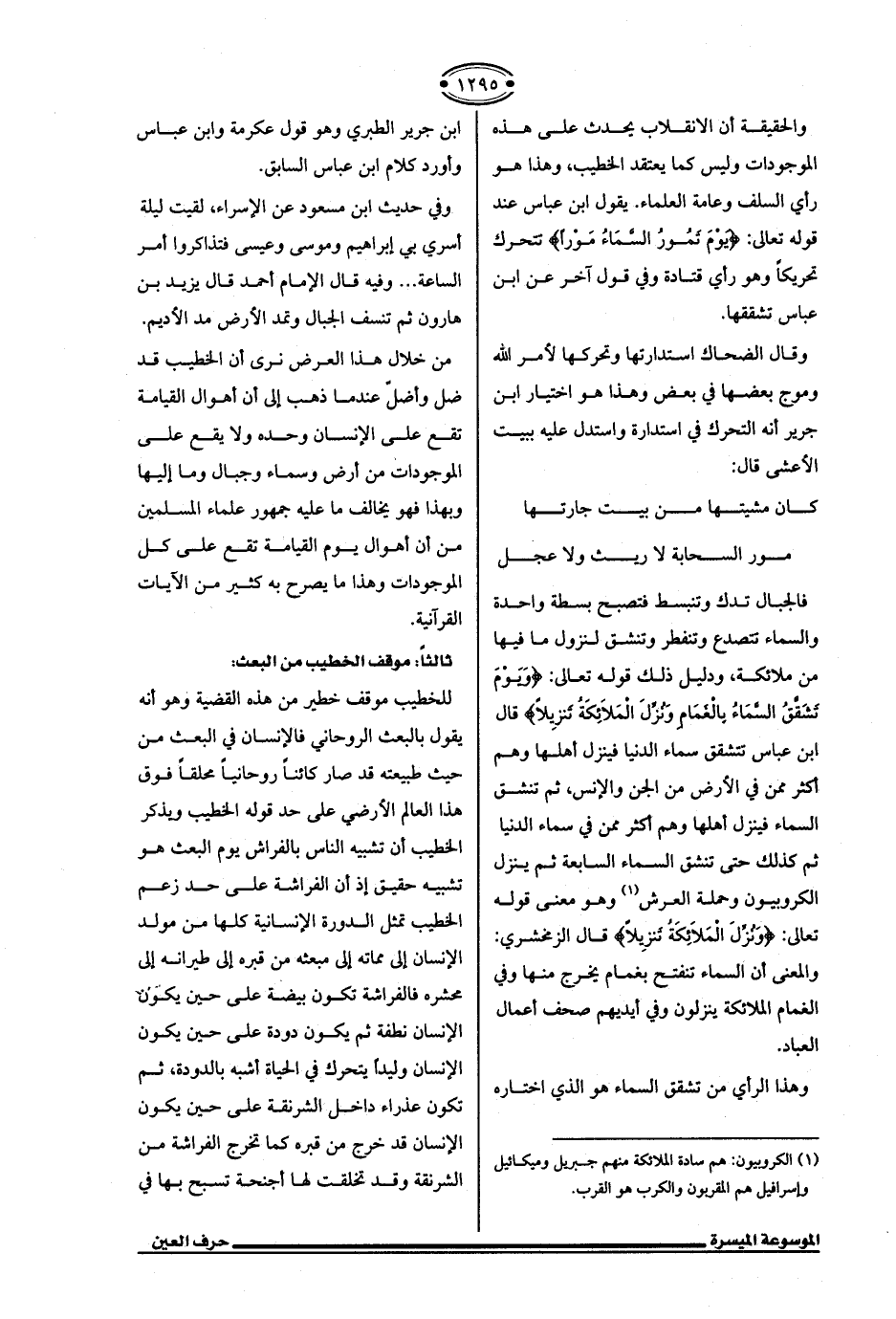 والحقيقة أن الانقلاب يحدث على هذه الموجودات وليس كما يعتقد الخطيب، وهذا هو رأي السلف وعامة العلماء. يقول ابن عباس عند قوله تعالى: {يَوْمَ تَمُورُ السَّمَاءُ مَوْرًا} تتحرك تحريكًا وهو رأي قتادة وفي قول آخر عن ابن عباس تشققها.