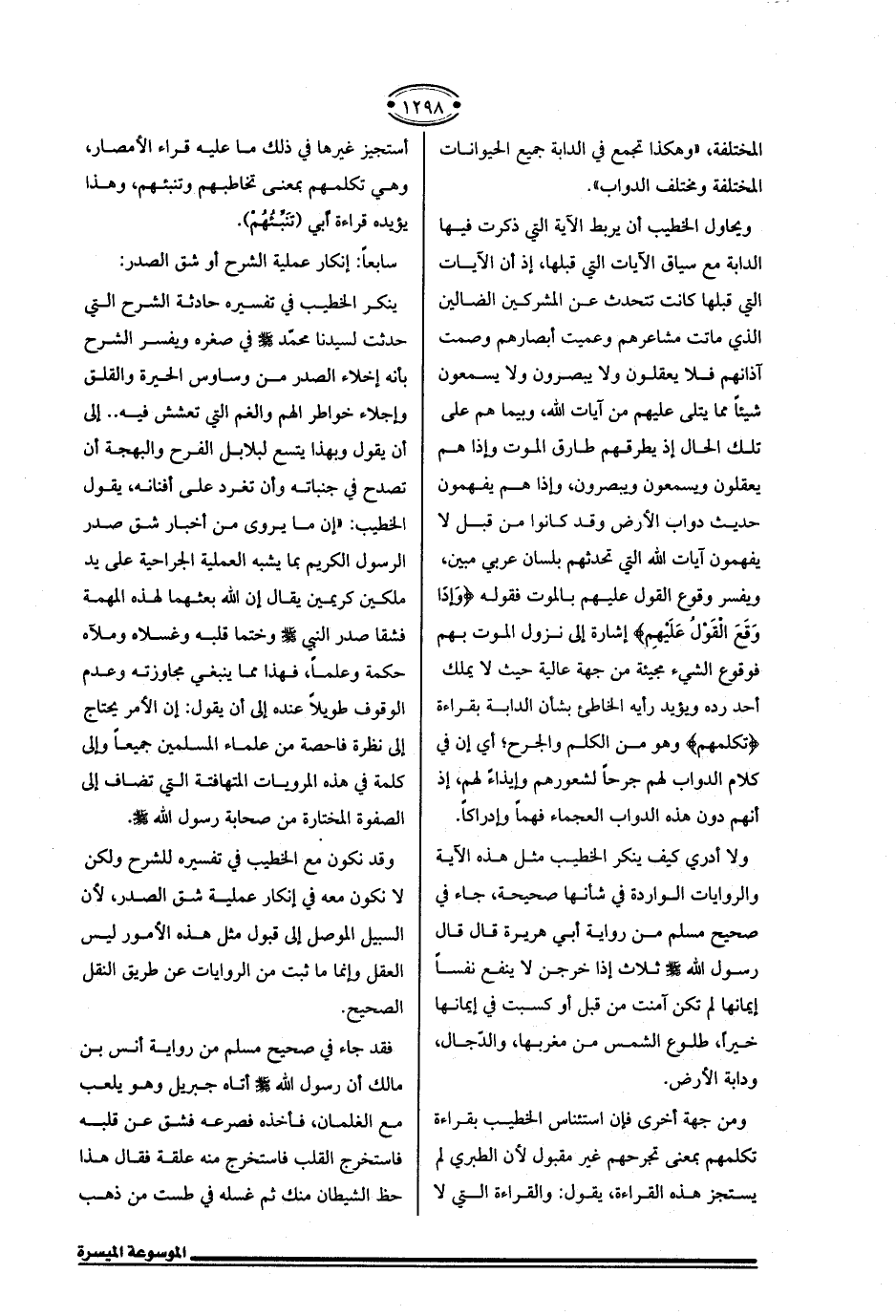 ولا أدري كيف ينكر الخطيب مثل هذه الآية والروايات الواردة في شأنها صحيحة، جاء في صحيح مسلم من رواية أبي هريرة قال قال رسول الله - صلى الله عليه وسلم - ثلاث إذا خرجن لا ينفع نفسًا إيمانها لم تكن آمنت من قبل أو كسبت في إيمانها خيرًا، طلوع الشمس من مغربها، والدّجال، ودابة الأرض.