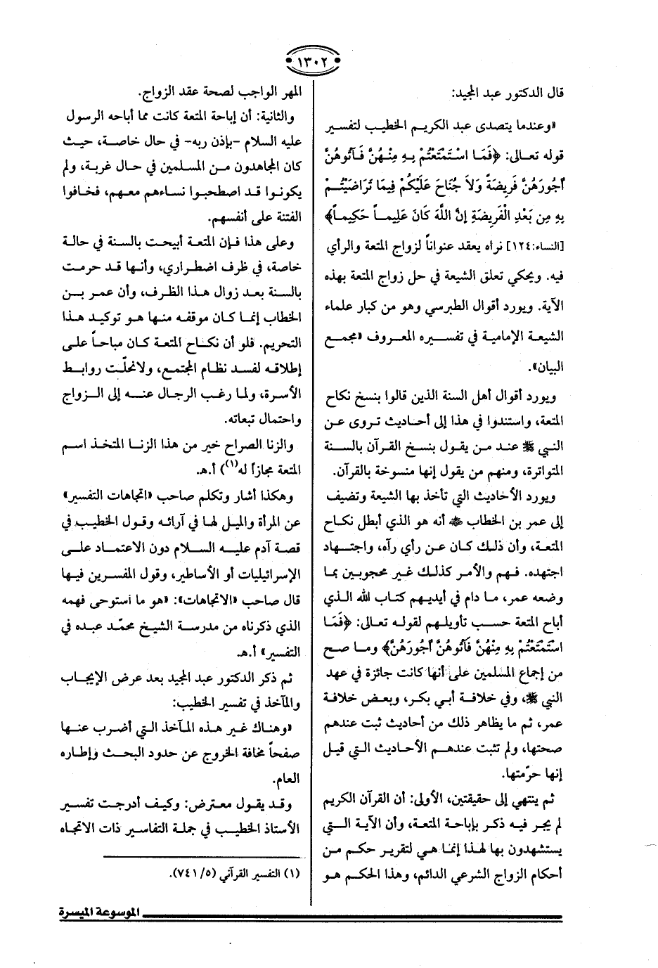 "وعندما يتصدى عبد الكريم الخطيب لتفسير قوله تعالى: {فَمَا اسْتَمْتَعْتُمْ بِهِ مِنْهُنَّ فَآتُوهُنَّ أُجُورَهُنَّ فَرِيضَةً وَلَا جُنَاحَ عَلَيكُمْ فِيمَا تَرَاضَيتُمْ بِهِ مِنْ بَعْدِ الْفَرِيضَةِ إِنَّ اللَّهَ كَانَ عَلِيمًا حَكِيمًا} [النساء: 124] نراه يعقد عنوانًا لزواج المتعة والرأي فيه. ويحكي تعلق الشيعة في حل زواج المتعة بهذه الآية. ويورد أقوال الطبرسي وهو من كبار علماء الشيعة الإمامية في تفسيره المعروف "مجمع البيان".