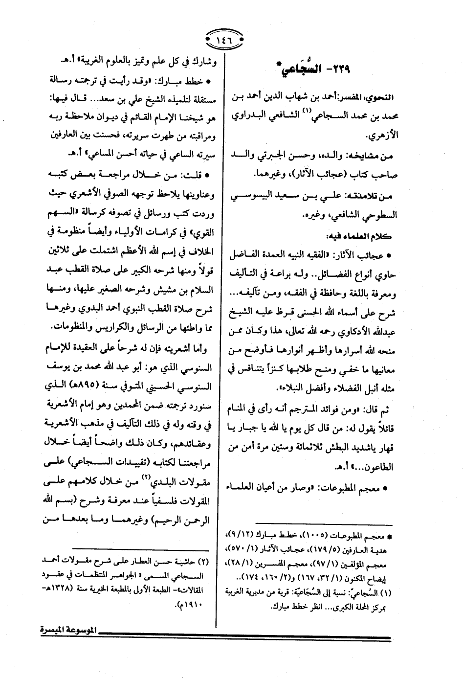(¬1) السُجاعي: نسبة أنَّ السُجَاعية: قرية من مديرية الغربية بمركز المحلة الكبرى ... انظر خطط مبارك.