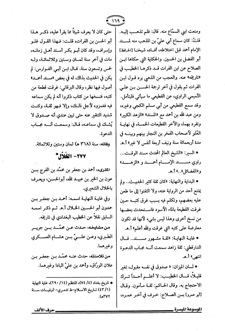 ومنعت ابني السمّاع منه. قال: فلم تذهب إليه. قلتُ: كان سماع أبي عليّ بن المذهب منه لمسند الإمام أحمد قبل اختلاطه، أفاده شيخنا [الحافظ] أَبو الفضل بن الحسين. والحكاية التي حكاها ابن الصلاح عن ابن الفرات قد ذكرها الخطيب في "تاريخه" عنه. والعجب من الذهبي يرد قول ابن الفرات ثم يقول في آخر ترجمة الحسن بن علي التميمي الراوي، عن القطيعي ما سيأتي فليتأمل. وقد سمع القطيعي من أبي مسلم الكجي وغيره، ومن عبد الله بن أحمد مع "المسند" "الزهد الكبير" وتفرد بهما، والآخر القطيعات الخمسة، في نهاية العُلو لأصحاب الفخر بن النجار بينهم وبينه في مدة أربعمائة سنة ونيف أربعة أنفس لا غير" أ. هـ.