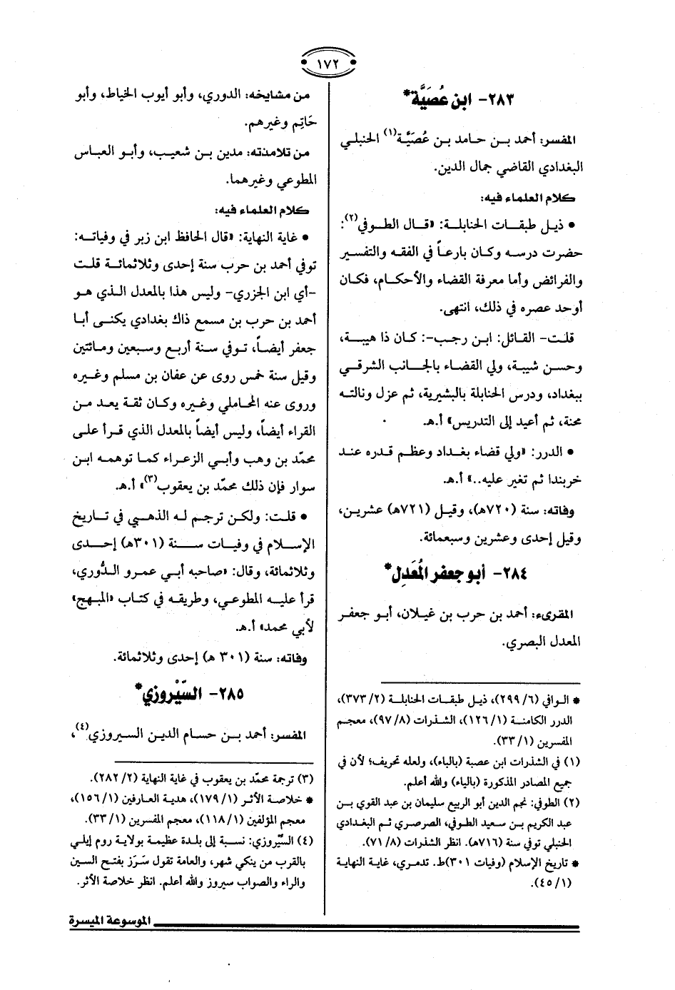 * غاية النهاية: "قال الحافظ ابن زبر في وفياته: توفي أحمد بن حرب سنة إحدى وثلاثمائة قلت -أي ابن الجزري- وليس هذا بالمعدل الذي هو أحمد بن حرب بن مسمع ذاك بغدادي يكنى أبا جعفر أيضًا، توفي سنة أربع وسبعين ومائتين وقيل سنة خمس روى عن عفان بن مسلم وغيره وروى عنه المحاملي وغيره وكان ثقة يعد من القراء أيضًا، وليس أيضًا بالمعدل الذي قرأ على محمّد بن وهب وأبي الزعراء كما توهمه ابن سوار فإن ذلك محمد بن يعقوب (¬3) " أ. هـ.