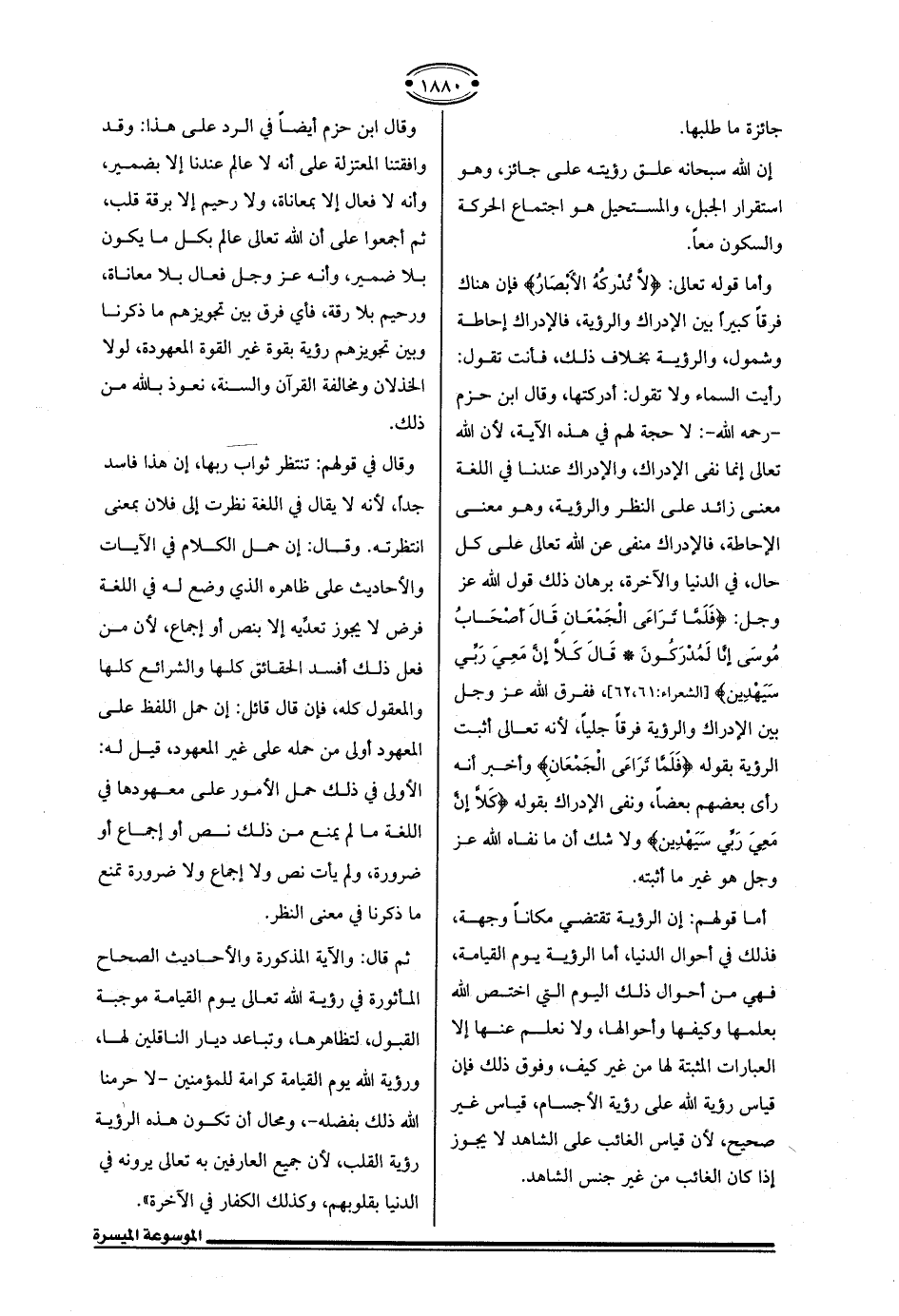 وقال في قولهم: تنتظر ثواب ربها، إن هذا فاسد جدًّا؛ لأنه لا يقال في اللغة نظرت إلى فلان بمعنى انتظرته. وقال: إن حمل الكلام في الآيات والأحاديث على ظاهره الذي وضع له في اللغة فرض لا يجوز تعديه إلا بنص أو إجماع؛ لأن من فعل ذلك أفسد الحقائق كلها والشرائع كلها والمعقول كله، فإن قال قائل: إن حمل اللفظ على المعهود أولى من حمله على غير المعهود، قيل له: الأولى في ذلك حمل الأمور على معهودها في اللغة ما لم يمنع من ذلك نص أو إجماع أو ضرورة، ولم يأت نص ولا إجماع ولا ضرورة تمنع ما ذكرنا في معنى النظر.