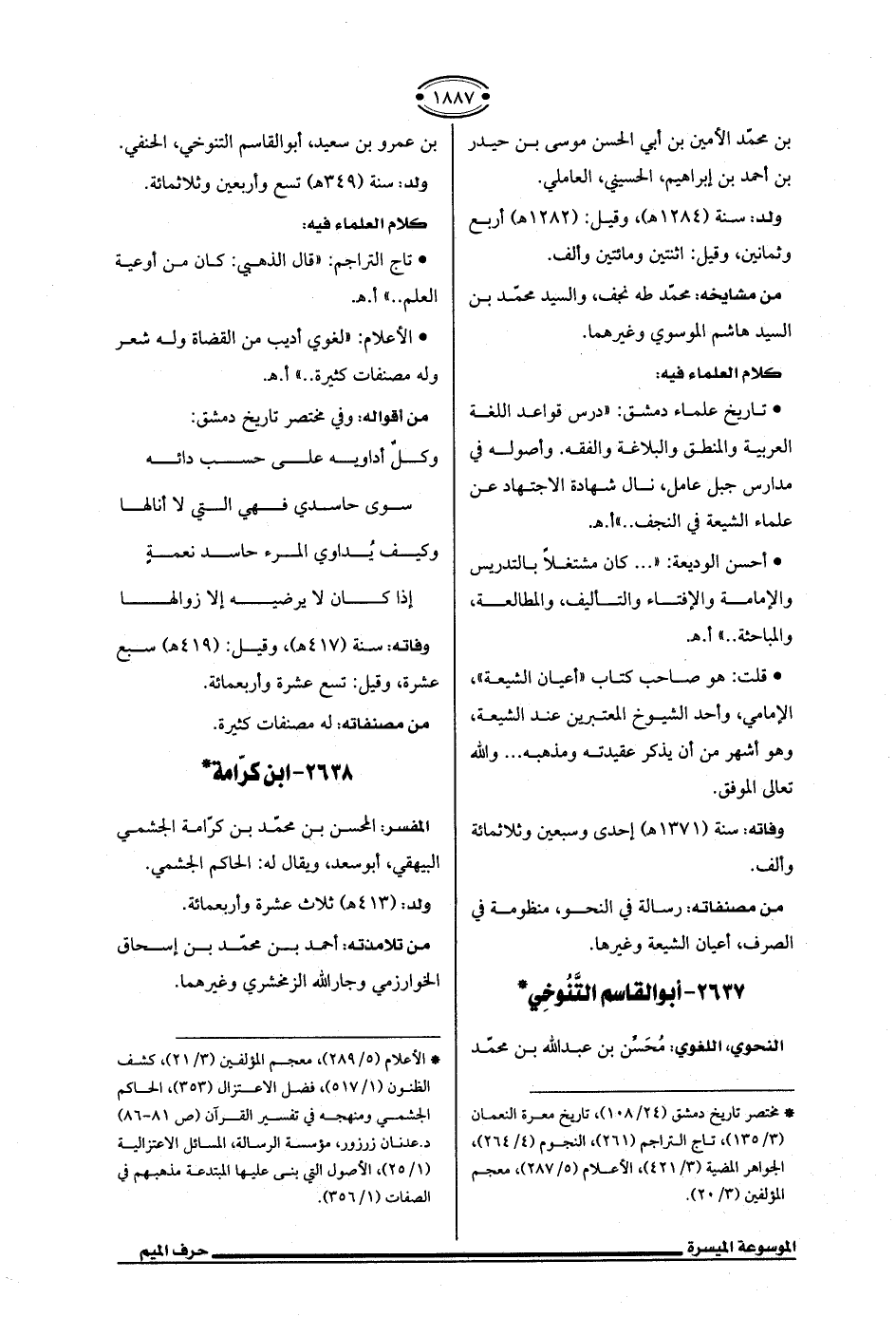 • قلت: هو صاحب كتاب "أعيان الشيعة"، الإمامي، وأحد الشيوخ المعتبرين عند الشيعة، وهو أشهر من أن يذكر عقيدته ومذهبه ... والله تعالى الموفق.