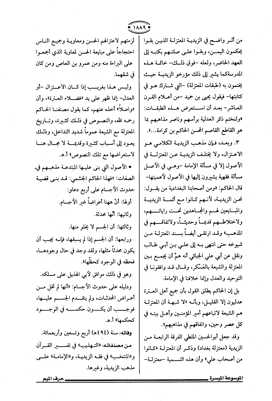 3. وبعد، فإن مذهب الزيدية الكلامي هو الاعتزال، ولا يختلف الزيدية عن المعتزلة في الأصول إلا في مسألة الإمامة -وهي في الأصل مسألة فقهية يشيرون إليها في الأصول لأهميتها- قال الحاكم: "ومن أصحابنا البغدادية من يقول: نحن الزيدية؛ لأنهم كانوا مع أئمة الزيدية والمبايعين لهم والمجاهدين تحت راياتهم، ولاختلاطهم قديمًا وحديثًا، ولاتفاقهم في المذهب" وقد ارتقى أيضًا بسند المعتزلة من شيوخه حتى انتهى به إلى علي بن أبي طالب ونقل عن أبي علي الجبائي أنه همَّ أن يجمع بين المعتزلة والشيعة بالعَسكر، وقال قد وافقونا في التوحيد والعدل وإنما خلافنا في الإمامة.