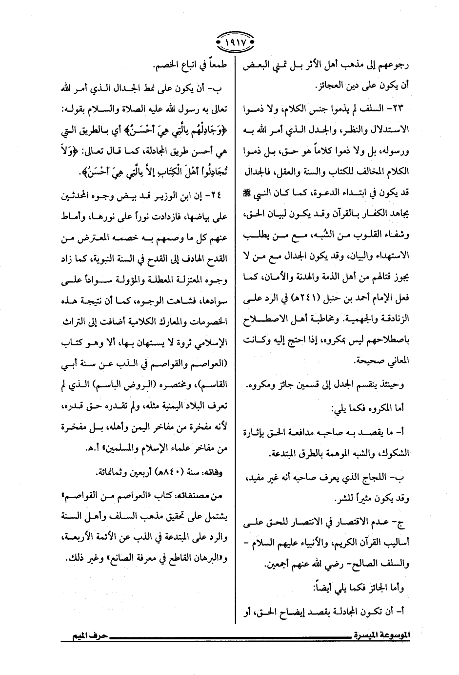 23 - السلف لم يذموا جنس الكلام، ولا ذموا الاستدلال والنظر، والجدل الذي أمر الله به ورسوله، بل ولا ذموا كلامًا هو حق، بل ذموا الكلام المخالف للكتاب والسنة والعقل، فالجدال قد يكون في ابتداء الدعوة، كما كان النبي - صلى الله عليه وسلم - يجاهد الكفار بالقرآن وقد يكون لبيان الحق، وشفاء القلوب من الشُبه، مع من يطلب الاستهداء والبيان، وقد يكون الجدال مع من لا يجوز قتالهم من أهل الذمة والهدنة والأمان، كما فعل الإمام أحمد بن حنبل (241 هـ) في الرد على الزنادقة والجهمية. ومخاطبة أهل الاصطلاح باصطلاحهم ليس بمكروه، إذا احتج إليه وكانت المعاني صحيحة.