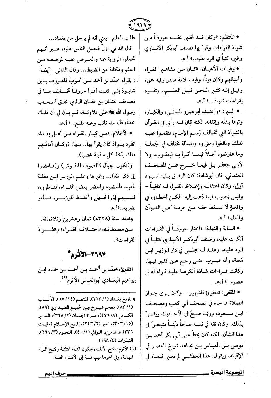 • الأعلام: "من كبار القراء من أهل بغداد انفرد بشواذ كان يقرأ بها .. منها: "وكان أمامَهم ملك يأخذ كل سفينة غصبا).