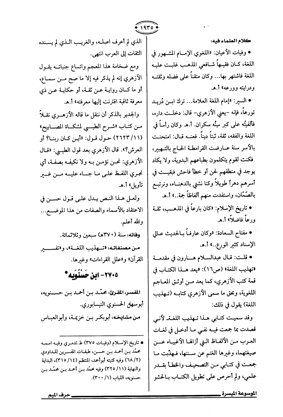 • قلت: قال عبد السلام هارون في مقدمة "تهذيب اللغة" (ص 16): "يعد هذا الكتاب في قمة كتب الأزهري، كما يعد من أوثق المعاجم اللغوية، وبحق ما سمى الأزهري كتابه (تهذيب اللغة) يقول في ذلك: