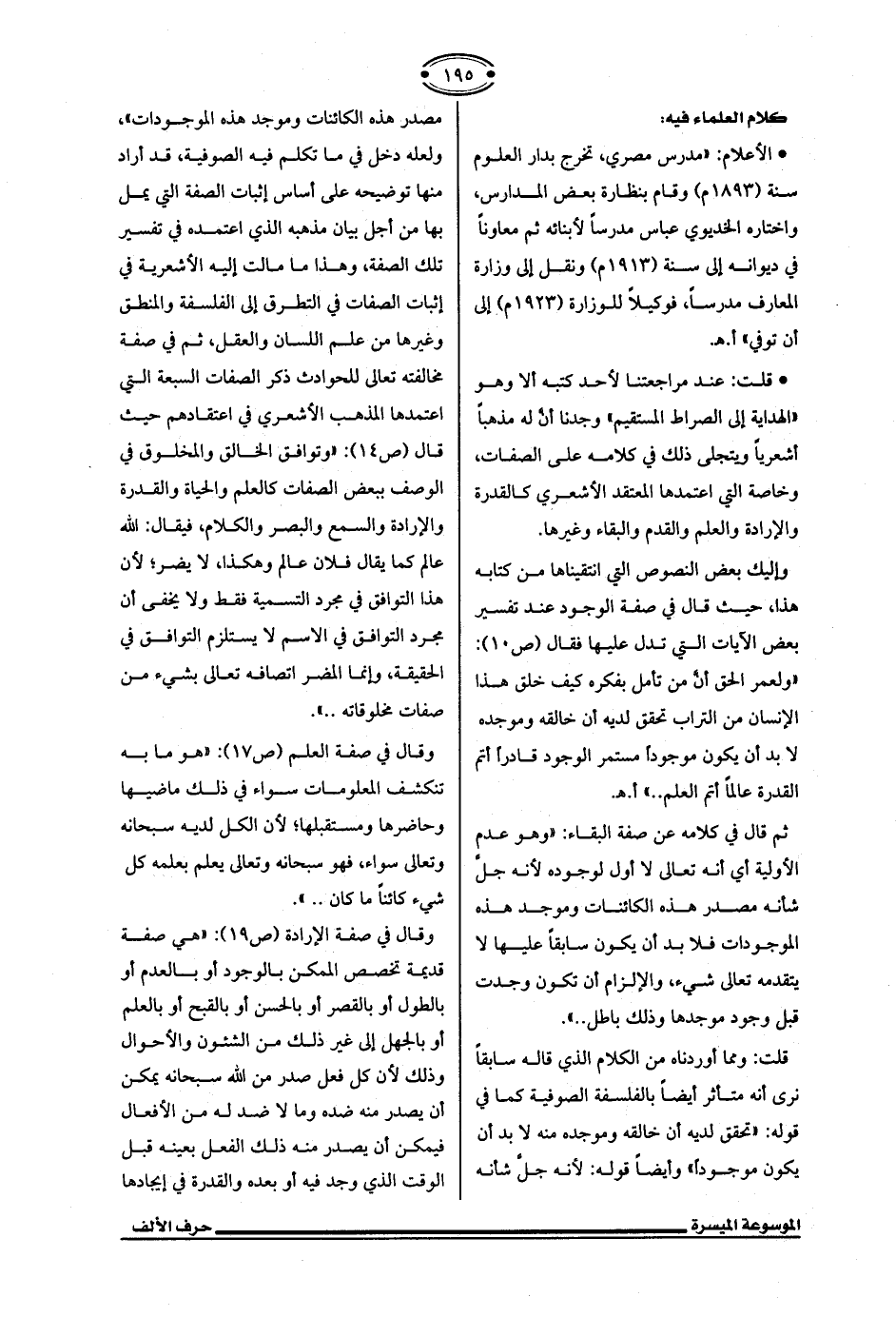 وقال في صفة العلم (ص 17): "هو ما به تنكشف المعلومات سواء في ذلك ماضيها وحاضرها ومستقبلها؛ لأن الكل لديه سبحانه وتعالى سواء، فهو سبحانه وتعالى يعلم بعلمه كل شيء كائنًا ما كان .. ".