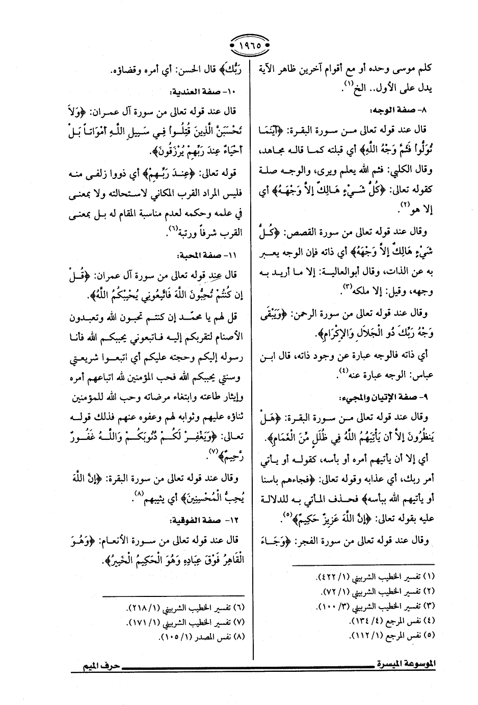 وقال عند قوله تعالى من سورة القصص: {كُلُّ شَيءٍ هَالِكٌ إلا وَجْهَهُ} أي ذاته فإن الوجه يعبر به عن الذات، وقال أبو العالية: إلا ما أريد به وجهه، وقيل: إلا ملكه (¬3).